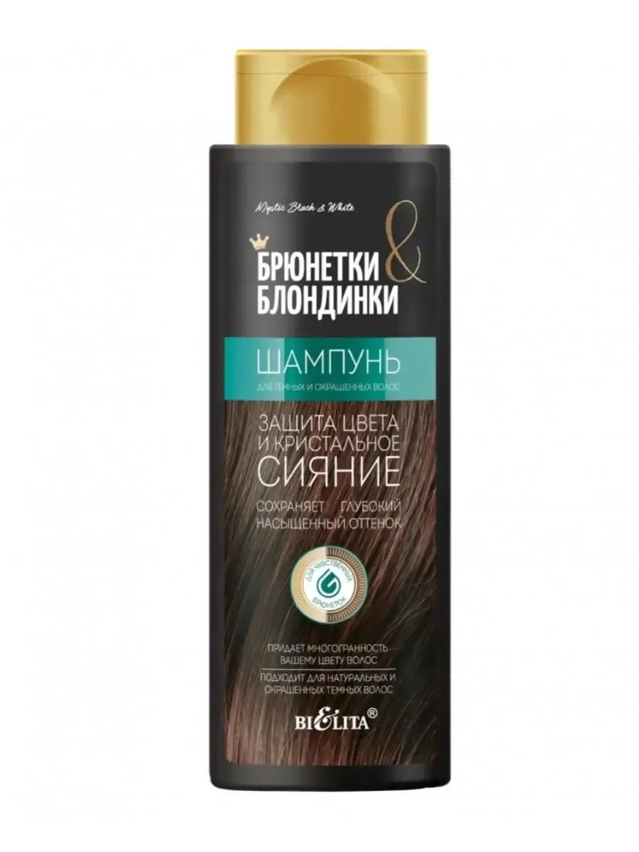 BELITA, Brunettes and Blondes, Shampoo for Dark and Colored Hair, 400 ml. This shampoo is specially formulated for those with natural and color-treated hair of any dark shade. It gently cleanses the scalp and hair of impurities, protects against dullness and color fading caused by chlorinated water, preserving the deep, rich color of luxurious dark hair. Its complex of active ingredients: - prevents color fading and color change - maintains color saturation and enhances vibrancy - imparts magnificent shine to dark hair - restores hair's beauty, softness, and healthy appearance.