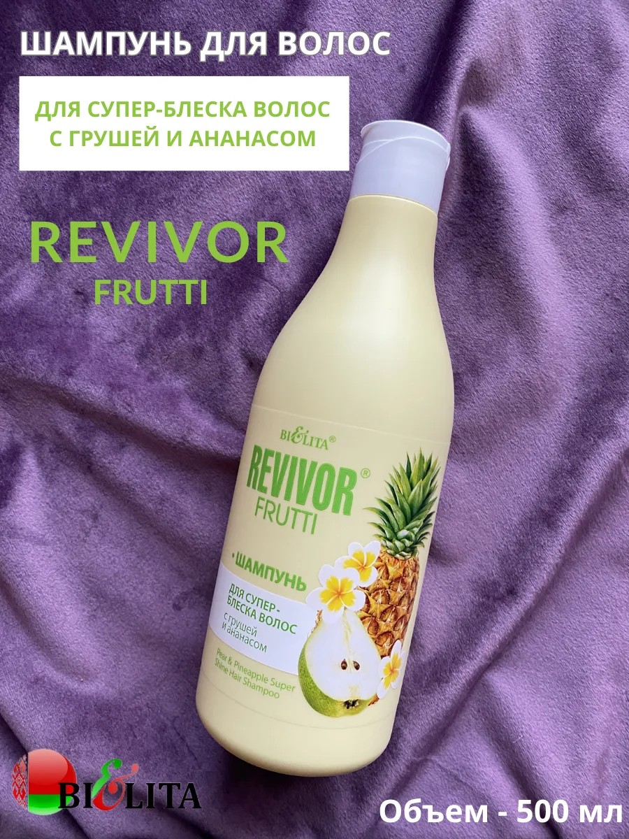 Revivor Frutti Super Shine Shampoo with Pear and Pineapple from the Belarusian cosmetics brand Belita. A delightful combination of the finest natural ingredients for brilliant shine! Experience the enchanting freshness of juicy pears and tropical pineapples every time you wash as this extraordinary shampoo works its magic on your locks. The meticulously crafted hair care formula is infused with nourishing microelements for healthy shine and smoothness. A unique blend of pear extract and pineapple juice gently cleanses hair, removing impurities and leaving it feeling fresh and light. The restorative formula penetrates deep into the roots, leaving hair strong and bouncy, less prone to breakage. Pear extract and pineapple juice infuse hair with vitamins and microelements, eliminating dullness and restoring healthy shine and smoothness. Revivor Frutti is a luscious formula with pear and pineapple fruit extracts that restores your hair's natural shine, imparting an incredible scent and healthy luster. Directions: Apply to damp hair, lather, and rinse.