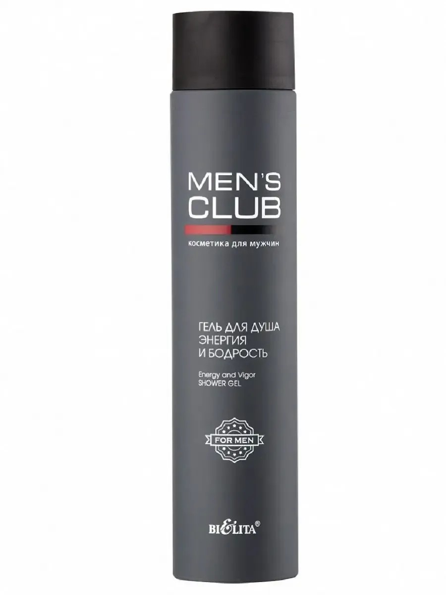 Гель для душа для мужчин Men's club . Подходит для ежедневного применения . Заряжающий энергией гель для душа тщательно очищает кожу , не нарушая ее липидный баланс , дарит ощущение бодрости и свежести . АКТИВНЫЕ КОМПОНЕНТЫ : Аллантоин успокаивает кожу и снимает раздражение , увлажняет и поддерживает водный баланс кожи на необходимом уровне . Кофеин и таурин заряжают кожу энергией , тонизируют и укрепляют ее . Продукция Белорусского бренда , чьи косметические уходовые средства - это всегда гарантия качества и выбор многих покупателей .