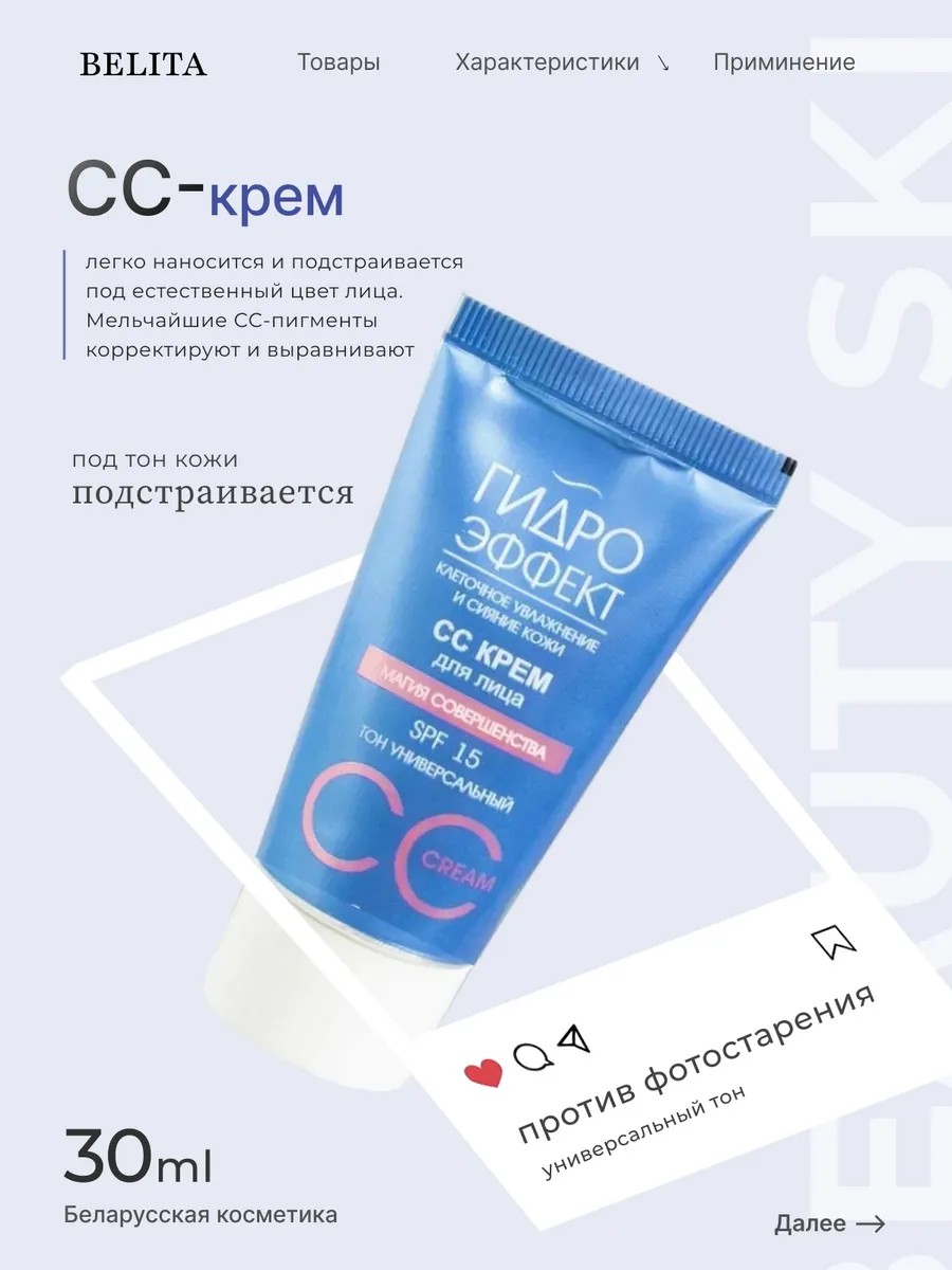 СС крем для лица «Магия Совершенства» — это лёгкое корректирующее средство с тонирующим эффектом для выравнивания тона кожи и придания естественного сияния. Крем адаптируется под индивидуальный оттенок кожи, обеспечивает ровное покрытие без эффекта маски и подходит для всех типов кожи, включая чувствительную и комбинированную.