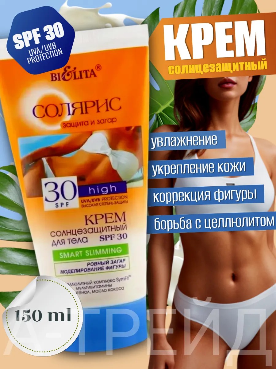 Белорусский многофункциональный крем для защиты от солнца с высокой степенью СПФ 30 линии Солярис 150 мл, разработанный по смарт-технологии, позволяет во время принятия солнечных ванн скорректировать и смоделировать фигуру, уменьшить проявление целлюлита и укрепить кожу, предотвратить вредное УФ воздействие и фотостарение, получить ровный красивый загар. Антицеллюлитный комплекс SymFit усиливает расщепление жиров в процессе похудения; блокирует заполнение жировых клеток; замедляет образование новых. Мультивитамины - комплекс витаминов А, Е, С, F - защищают эпидермис от фотоповреждения, регулируют синтез коллагена, обеспечивают антиоксидантное действие и получение красивого оттенка кожи. Масло кокоса питает, смягчает, увлажняет, обеспечивает естественную защиту от вредного солнечного излучения. D-пантенол - эффективное успокаивающее средство для снятия симптомов солнечных ожогов: жжения и покраснения.