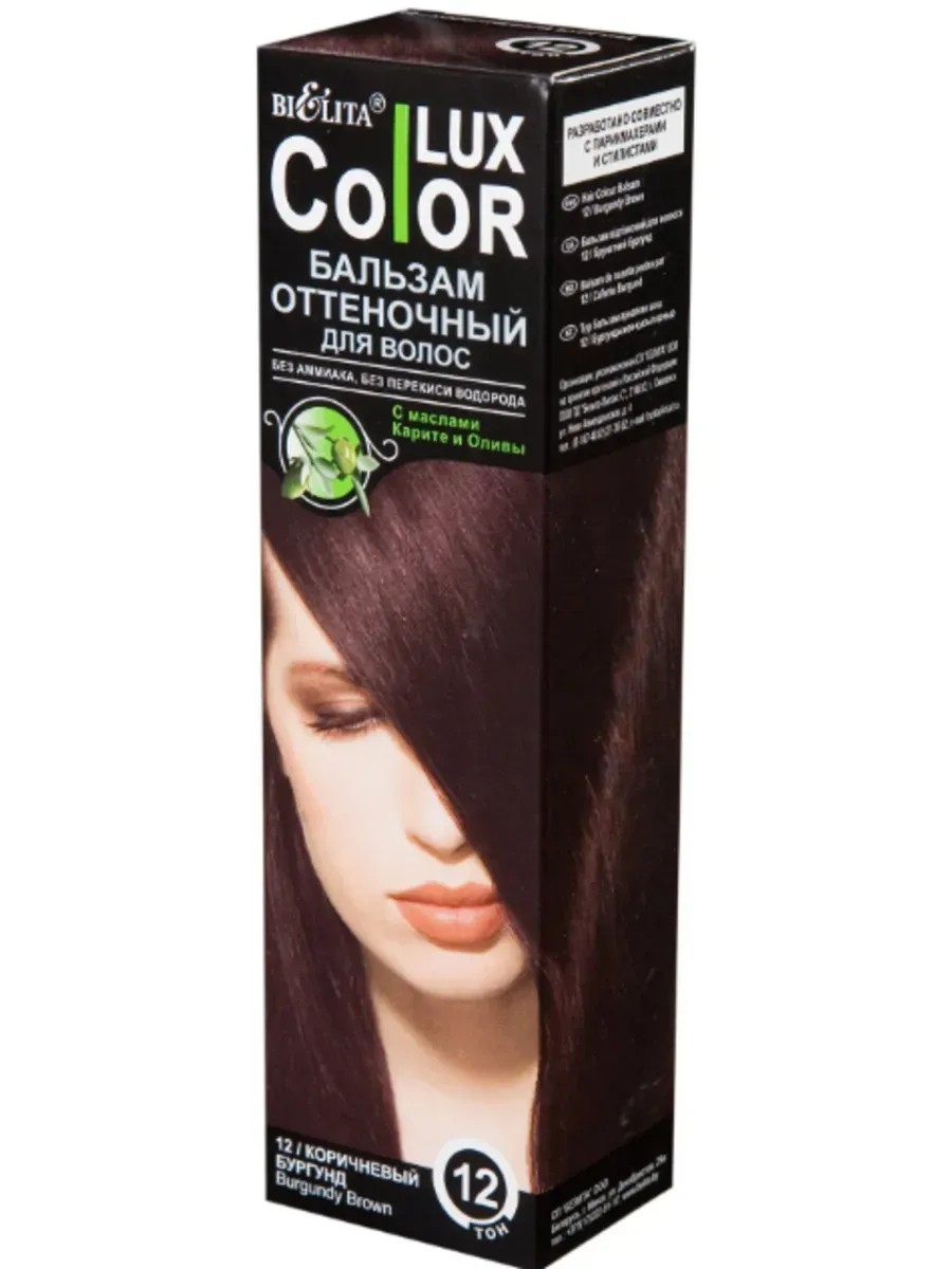 Bielita, Оттеночный бальзам Color Lux тон 12 коричневый бургунд 100 мл., 1 шт. Оттеночный бальзам позволяет получить модный насыщенный оттенок и не вредит волосам. Его питательные компоненты дополнительно увлажняют и питают. Пигментированное средство выделит цвет ваших локонов и сделает его привлекательным.