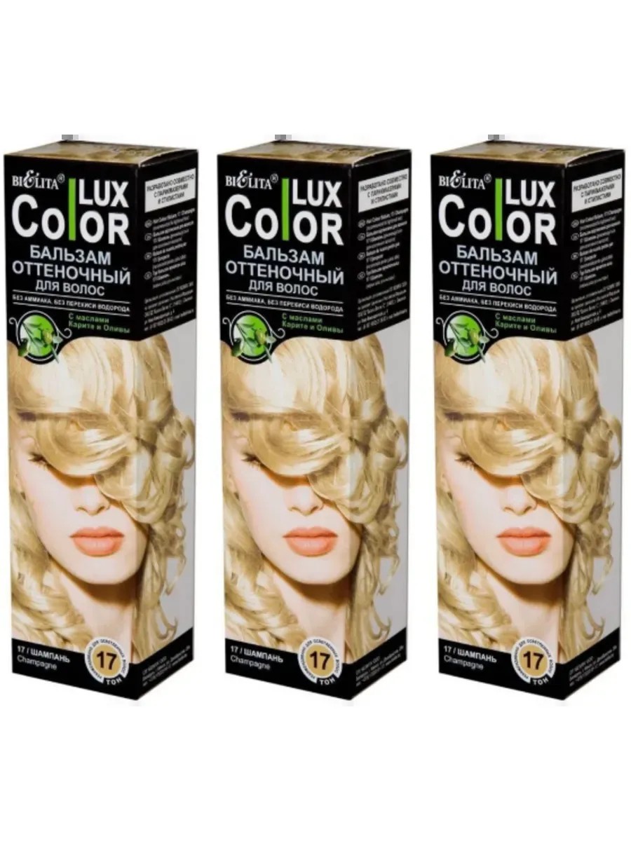 Bielita, Оттеночный бальзам Color Lux тон 17 шампань 100 мл., комплект из 3 шт. Оттеночный бальзам позволяет получить модный насыщенный оттенок и не вредит волосам. Его питательные компоненты дополнительно увлажняют и питают. Пигментированное средство выделит цвет ваших локонов и сделает его привлекательным.