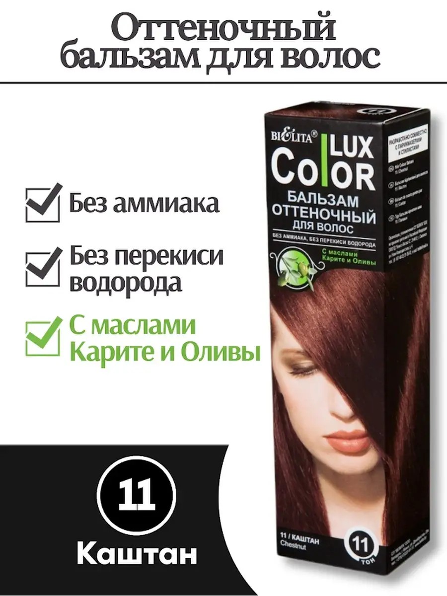 Оттеночный бальзам для волос COLOR LUX белорусской косметики BIELITA. Тонирующий бальзам для волос бережно и эффективно окрасит ваши волосы. Не раздражает кожу головы благодаря отсутствию в составе аммиака и перекиси водорода. Пигменты в составе краски без аммиака не повреждают структуру волос, хорошо удерживаются чешуйками кутикулы поверхностного слоя волос. Натуральные масла оливы и карите, выравнивают и улучшают структуру волос. Яркость цвета достигается уже после однократной процедуры окрашивания. Бальзам COLOR LUX – это превосходная тонировка для волос без вреда для их состояния. Попробуйте, и Вы приятно удивитесь!