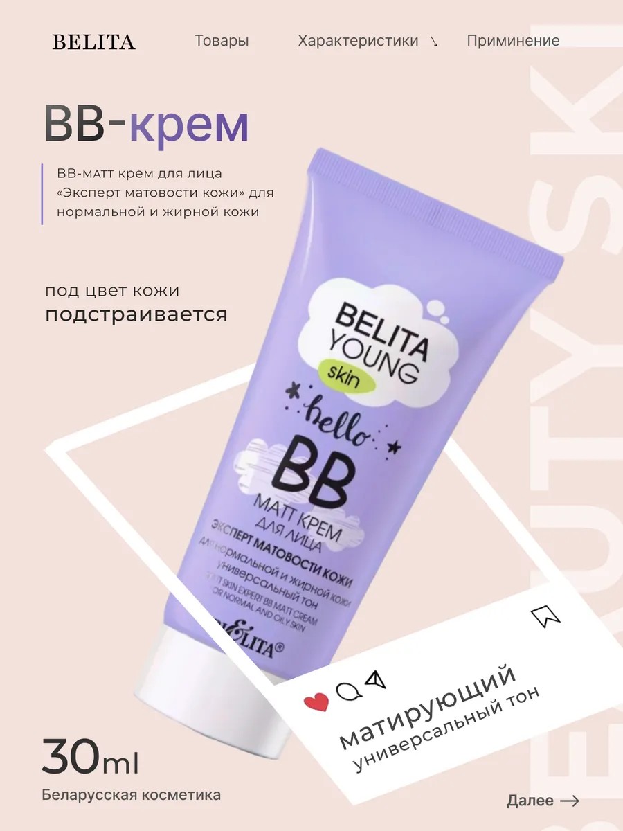 ВВ-matt крем для лица от BELITA YOUNG SKIN , белорусская косметика безупречное сияние— это идеальное решение для обладателей нормальной и жирной кожи, стремящихся к безупречному матовому финишу. Этот крем не только выравнивает микрорельеф и скрывает недостатки, но и эффективно маскирует нежелательный блеск, обеспечивая красивый цвет лица. Благодаря уникальной формуле с Sebaryl, он нормализует работу сальных желез, уменьшает поры и дарит длительный матирующий эффект. Легкая текстура крема подстраивается под тон кожи, создавая естественный и свежий вид. Позвольте себе роскошь матовой кожи без изъянов с ВВ-matt кремом — ваш идеальный спутник в уходе за лицом! Этот ВВ-matt крем для лица — настоящий бестселлер среди белорусской косметики, идеально подходящий для молодого поколения и женщин, стремящихся к безупречному макияжу. Он действует как тональный праймер, обеспечивая выравнивание кожи и создавая идеальную базу перед нанесением макияжа. Крем особенно полезен для подростков и девочек с проблемной и комбинированной кожей, склонной к высыпаниям и прыщам, благодаря своему натуральному и некомедогенному составу. Этот дневной уходовой продукт станет незаменимым помощником в борьбе с несовершенствами, обеспечивая профессиональный результат и здоровый вид кожи. ВВ-matt крем для лица от BELITA YOUNG SKIN — это не просто женская косметика для лица, а полноценная уходовая косметика для лица для подростков, которая заботится о вашей коже каждый день. Этот krem для лица из Беларуси — идеальный выбор для тех, кто ищет крем от высыпания на лице, обеспечивающий надежную защиту и уход. Включите его в свою косметику для лица и наслаждайтесь безупречным результатом!