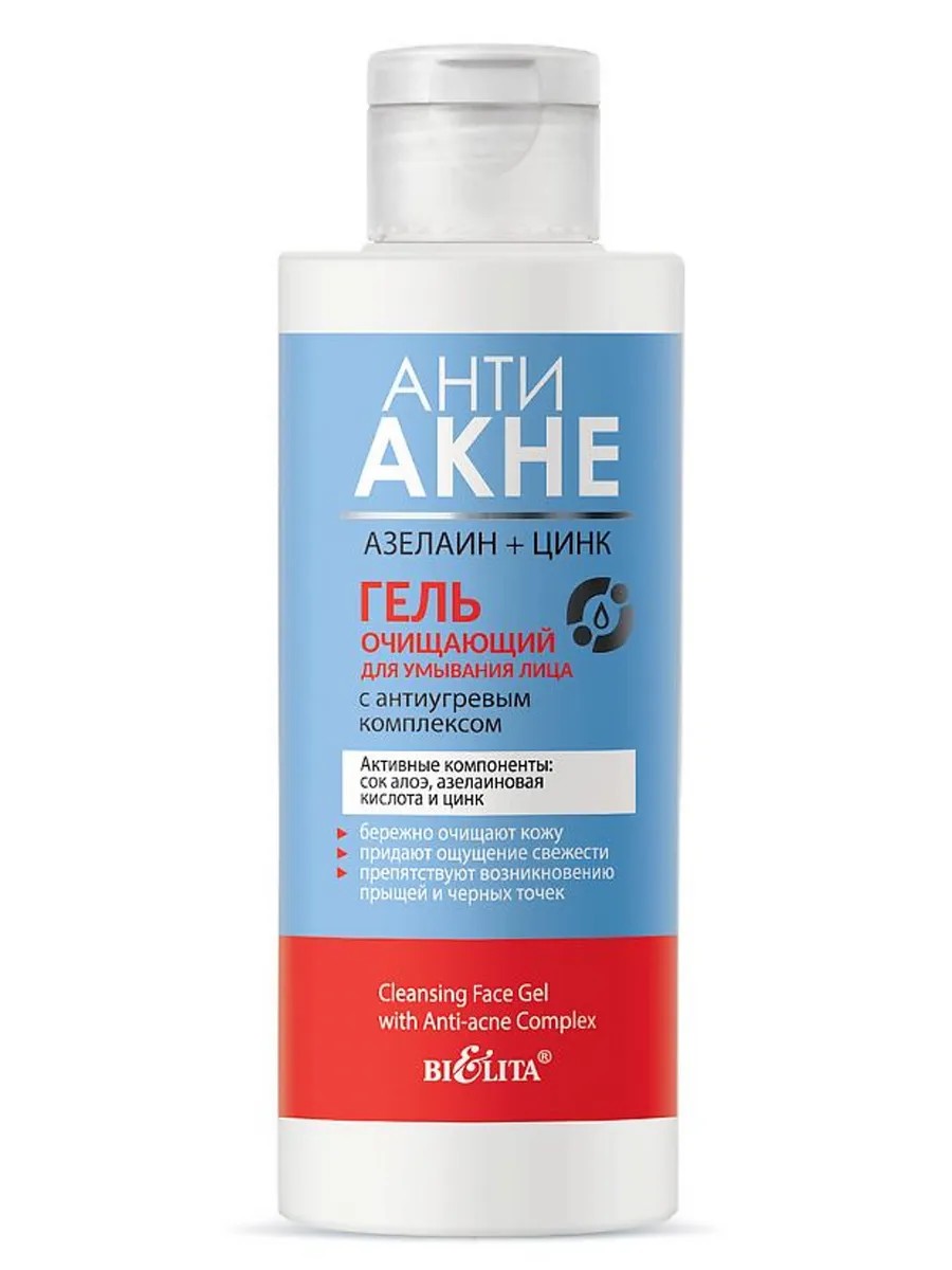 Bielita Гель для умывания очищающий анти акне 150 мл. Идеальное решение для создания чистой, свежей, без пятен и прыщей, кожи. Он эффективно и при этом бережно очищает ее. Комплекс активных компонентов воздействует на бактерии, вызывающие акне, уменьшая воспаление и предотвращая появление новых высыпаний. Умывая лицо с помощью нашего геля, вы почувствуете освежающее ощущение от того, как его формула работает над очищением пор, удаляя загрязнения и излишки жира. Легкая и пенистая текстура обеспечивает тщательное очищение, не пересушивая и не раздражая кожу. Очищающий гель подходит для всех типов кожи. При постоянном использовании вы заметите видимые улучшения текстуры и тона кожи. Активные компоненты (сок алоэ, азелаиновая кислота и цинк): бережно очищают кожу, придают ощущение свежести, препятствуют возникновению прыщей и черных точек.