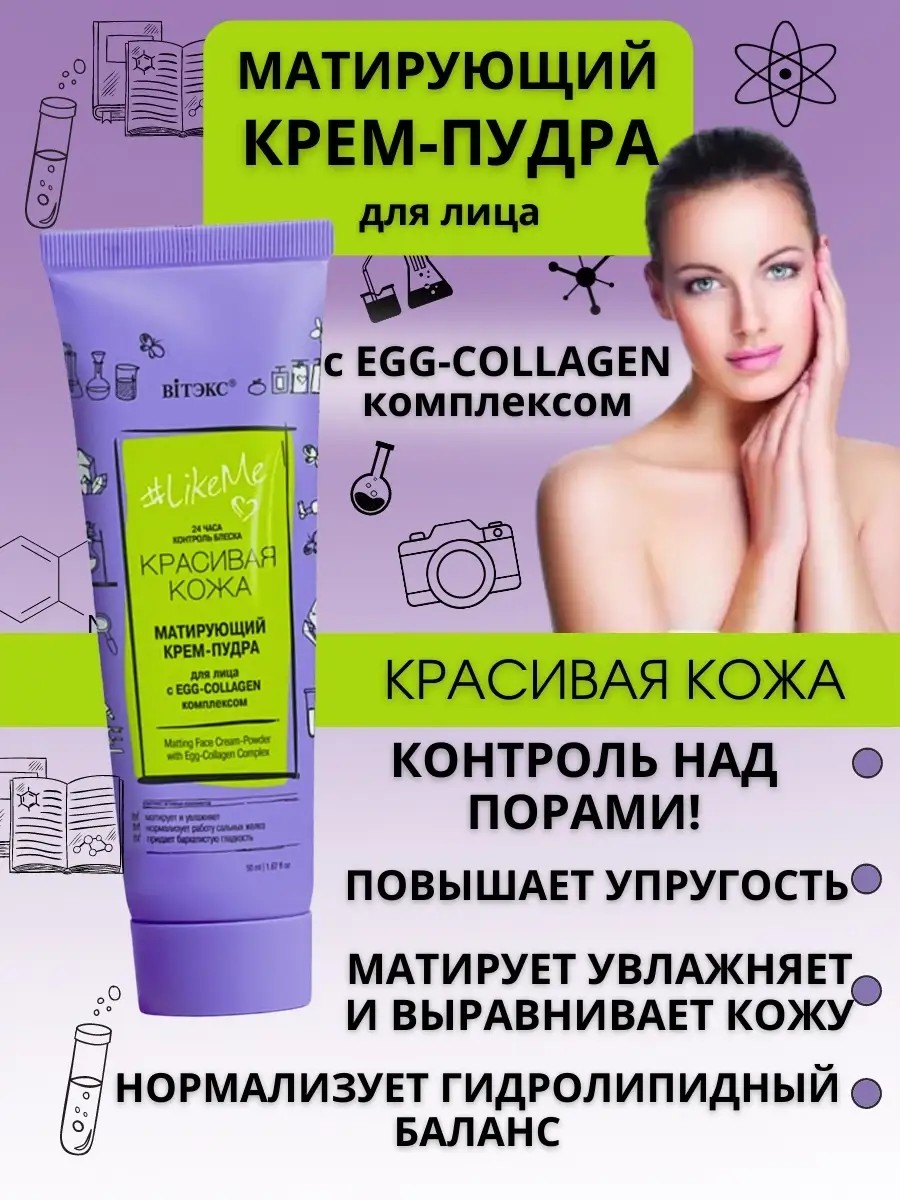 КРЕМ-ПУДРА С EGG-COLLAGEN КОМПЛЕКСОМ ИМЕЕТ ПУДРОВО-БАРХАТНУЮ ТЕКСТУРУ, крем легко распределяется на коже, образуя матирующую, увлажняющую и разглаживающую сеточку, которая ухаживает за кожей 24 часа. Сразу же после нанесения поры становятся менее заметными, исчезает нежелательный блеск, кожа приобретает приятную гладкость и бархатистость. При регулярном использовании восстанавливается нормальный гидролипидный баланс в коже, повышается ее упругость, цвет лица становится однородным и ярким. повышают эластичность кожи и стенок пор, благодаря чему расширенные поры постепенно стягиваются и уменьшаются. Яичный белок помогает активно бороться с активной работой сальных желез и заметно сужает поры, эффективно удаляет кожное сало из глубины пор, устраняет черные точки и предотвращает их появление. Крем-пудра, тональный крем, косметика уходовая крема белорусская косметика для лица пудра.