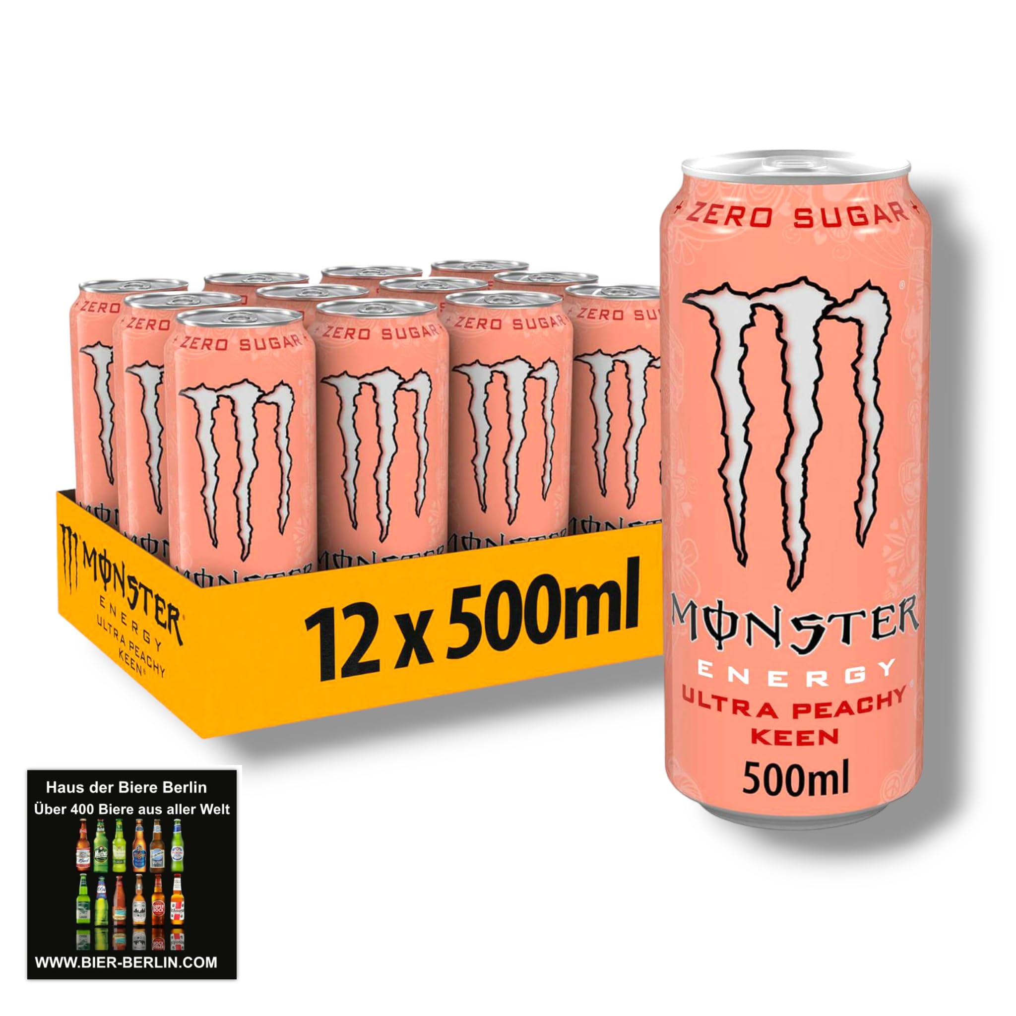 The latest monster in the Ultra series. Monster Ultra Peachy Keen is a lower-sugar monster energy drink with the refreshing taste of peach. The complete Monster energy mix, but with no added sugar. Smooth flavors, but a powerful boost. INGREDIENTS Carbonated water, citric acid, taurine, sodium citrate, panax ginseng flavor, potassium sorbate (preservative), caffeine, sucralose, modified corn starch, medium-chain triglycerides, sodium benzoate (preservative), niacinamide (Vit. B3), acesulfame potassium, natural flavors, salt, calcium pantothenate (Vit. B5), L-carnitine L-tartrate, inositol, pyridoxine hydrochloride (Vit. B6), color (yellow 5, yellow 6), cyanocobalamin (Vit. B12).The complete Monster energy mix, but with no added sugar. Smooth flavors but a powerful boost. The latest monster in the Ultra series. Monster Ultra Peachy Keen is a less sweet Monster energy drink with the refreshing taste of peach.Monster Energy Ultra Peachy Keen - Zero Sugar Energy - Lot de 12 boîtes de 500 ml - Dessous de verre avec maison des bières de BerlinDESCRIPTION DU PRODUIT DESCRIPTION DU PRODUIT Le dernier monstre de la série Ultra. Monster Ultra Peachy Keen est une boisson énergétique monstre moins sucrée avec le goût rafraîchissant de la pêche. Le mélange énergétique Monster complet, mais sans sucre ajouté. Arômes doux mais un boost puissant. INGRÉDIENTS eau gazeuse, acide citrique, taurine, citrate de sodium, arôme de ginseng panax, sorbate de potassium (conservateur), caféine, sucralose, amidon de maïs modifié, triglycérides à chaîne moyenne, benzoate de sodium (conservateur), niacinamide (Vit. B3), acésulfame de potassium, arômes naturels, sel, pantothénate de calcium D-calcium (Vit. B5), L-carnitine L-tartrate, inositol, chlorhydrate de pyridoxine (Vit. B6), couleur (jaune 5, jaune 6), cyanocobalamine (Vit. B12).Le mélange énergétique Monster complet, mais sans sucre ajouté. Arômes doux mais un coup de pouce puissant. Le dernier monstre de la série Ultra. Monster Ultra Peachy Keen est une boisson énergétique Monster moins sucrée avec le goût rafraîchissant de la pêche.