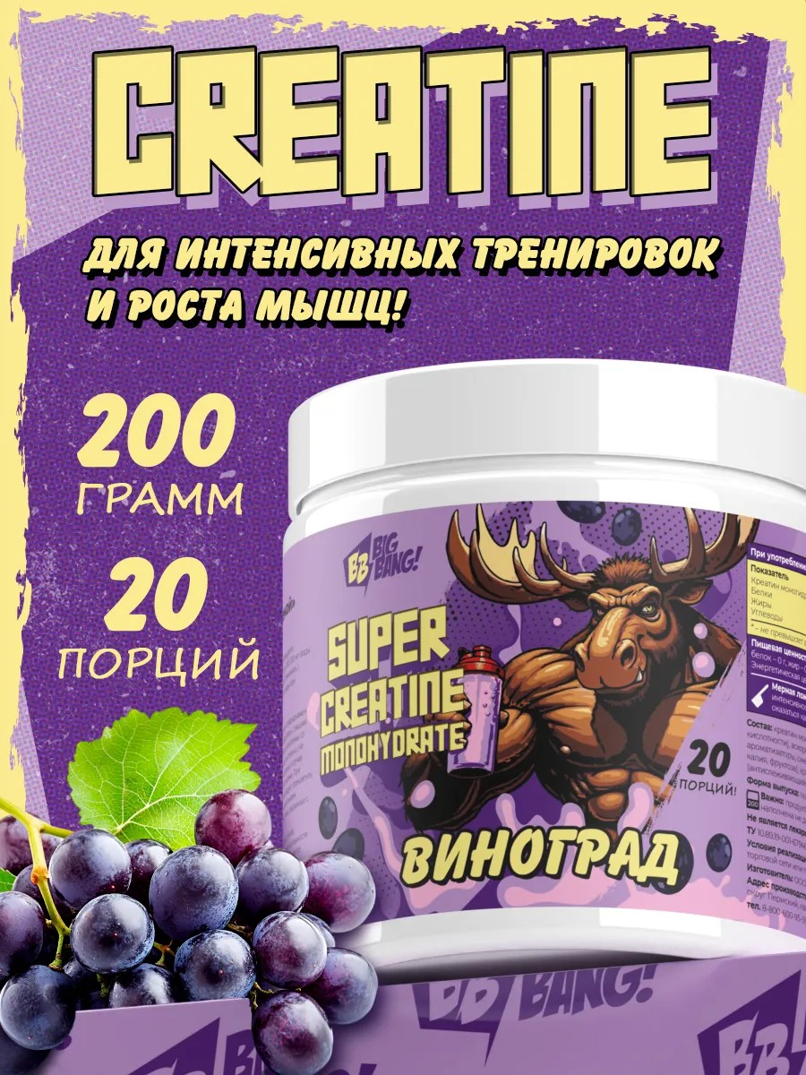 Креатин со вкусом винограда от "BigBang" 200 грамм – популярная добавка среди спортсменов. Это эффективное средство для наращивания мышечной массы. Порошок легко смешивается с напитками. Виноградный вкус делает его оригинальным и приятным в использовании.