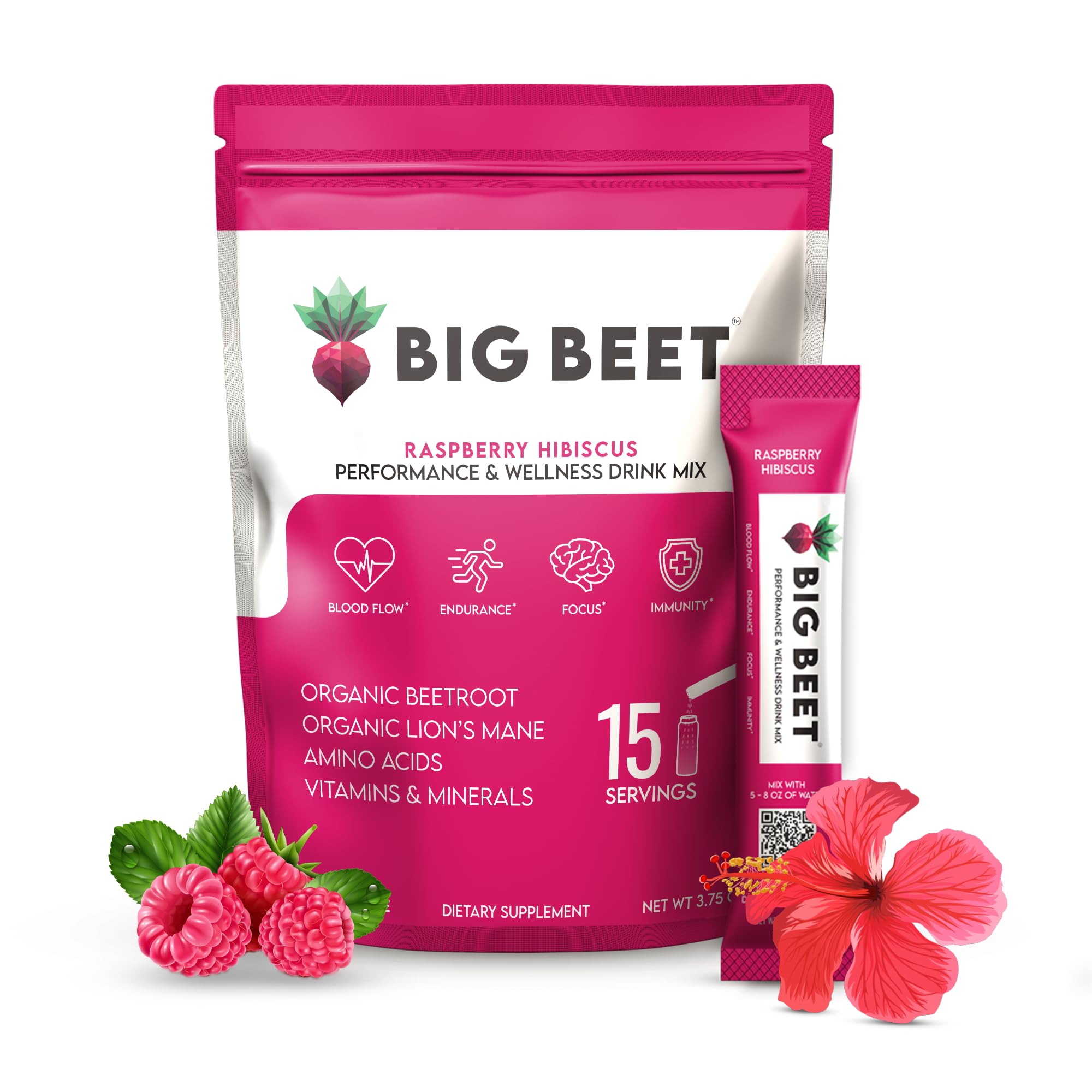 Big Beet Performance & Wellness Drink Mix | Raspberry Hibiscus | Organic Superfoods | Organic Nootropics | Vitamins & Minerals | Zero Added Sugar | 15 ct.