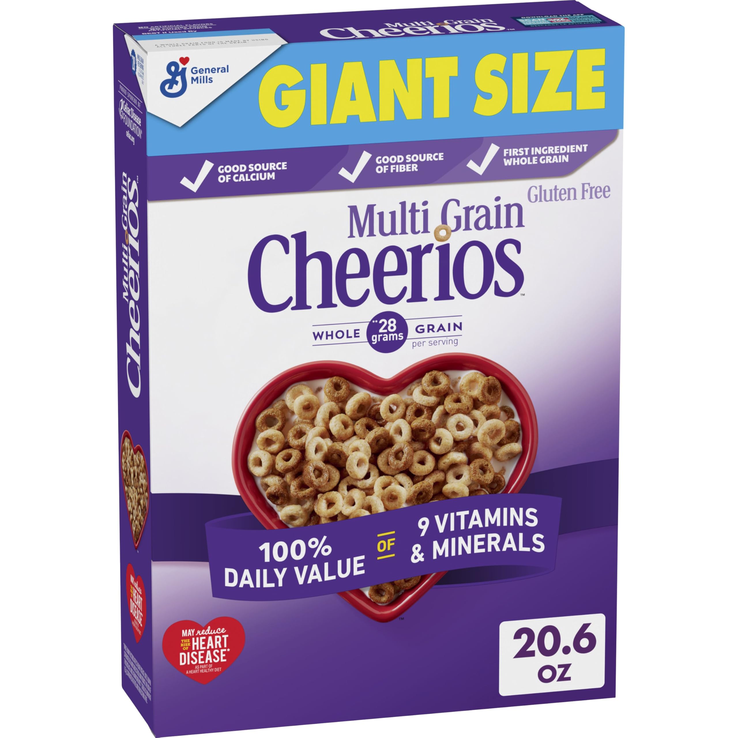 : O-so-good mornings start with Multi Grain Cheerios Cereal! Made without artificial flavors, enjoy the energy of whole grains as the first ingredient. Starting your morning with a bowl can help you get your day off to a great start. This lightly sweetened cereal provides 100 of the daily value of 9 vitamins and minerals, and 28g of whole grains per serving (at least 48g of whole grains recommended daily). It's gluten-free, a good source of calcium, and a good source of fiber. This delicious cereal for adults and children has more goodness than you're looking for. Plus, Multi Grain Cheerios is low in fat (1.5g), with no saturated fat and no cholesterol. Ingredients: Whole Grain Oats, Whole Grain Corn, Sugar, Whole Grain Rice, Corn Starch, Brown Sugar Syrup, Salt, Tripotassium Phosphate, Color (Caramel Color, Rock Extract). Vitamin E (mixed tocopherols) added to preserve freshness. Vitamins and minerals: calcium carbonate, iron and zinc (mineral nutrients), vitamin B (niacinamide), vitamin C (sodium ascorbate), vitamins A and B (calcium pantothenate), vitamin B6 (pyridoxine hydrochloride), vitamin B2 (riboflavin), vitamin B1 (thiamine mononitrate), vitamin B1 (folic acid), vitamin B1-2, vitamin A (palmitate), vitamin D3.Contains one 584g giant box of Cheerios Multi Grain cereal. Serve a bowl with milk for breakfast add it to homemade granola bars, kids' snacks, or trail mix a great pantry staple. A heart-healthy cereal while many factors affect heart disease, diets low in saturated fat and cholesterol may reduce the risk. Cheerios Multi Grain cereal is low in fat (1.5g), with no saturated fat and no cholesterol. Made without artificial flavors or colors from artificial sources, this gluten-free cereal is a good source of calcium and fiber. 28g of whole grains per serving (at least 48g recommended daily) plus 100 of the daily value of 9 vitamins and minerals.Description du produit O-so-good mornings start with Multi Grain Cheerios Cereal! Fabriqué sans arômes artificiels, profitez de l'énergie des grains entiers comme premier ingrédient. Commencer votre matin avec un bol peut vous aider à suivre votre chemin pour la journée. Ces céréales légèrement sucrées fournissent 100 de valeur quotidienne de 9 vitamines et minéraux, et 28 g de grains entiers par portion (au moins 48 g de grains entiers recommandés par jour). Il est sans gluten, une bonne source de calcium et une bonne source de fibres. Ces délicieuses céréales pour adultes et enfants ont plus de bienfaits que vous recherchez. De plus, les céréales Multi Grain Cheerios sont faibles en graisses (1,5 g), sans graisses saturées et sans cholestérol. Ingrédients Avoine à grains entiers, maïs à grains entiers, sucre, riz à grains entiers, amidon de maïs, sirop de sucre brun, sel, phosphate tripotassique, colorant (couleur caramel, extrait de rocher). Vitamine E (mélange de tocophérols) ajoutée pour préserver la fraîcheur. Vitamines et minéraux : carbonate de calcium, fer et zinc (nutriments minéraux), vitamine B (niacinamide), vitamine C (ascorbate de sodium), vitamine A B (pantothénate de calcium), vitamine B6 (chlorhydrate de pyridoxine), vitamine B2 (riboflavine), vitamine B1 (mononitrate de thiamine), vitamine B (folique acide), vitamine B1 2. Vitamine A (palmitate), vitamine D3.Contient une boîte géante de 584 g de céréales Cheerios multi-grains. Servez un bol avec du lait dans le cadre du petit-déjeuner ajoutez-le à des barres de céréales faites maison, à des collations pour enfants ou à un mélange de sentiers un incontournable idéal pour le garde-manger. Une céréale saine pour le cœur alors que de nombreux facteurs affectent les maladies cardiaques, les régimes pauvres en graisses saturées et en cholestérol peuvent réduire le risque de cette maladie. Les céréales Multi Grain Cheerios sont faibles en graisses (1,5 g), sans graisses saturées et sans cholestérol. Fabriquées sans arôme artificiel et sans couleur provenant de sources artificielles, ces céréales sans gluten sont une bonne source de calcium et de fibres. 28 g de grains entiers par portion (au moins 48 g recommandés par jour) plus 100 de valeur quotidienne de 9 vitamines et minéraux.Big G Cereal Multi Grain Cheerios Gluten Free Cereal, 20.6 OZ Giant Size Cereal Box
