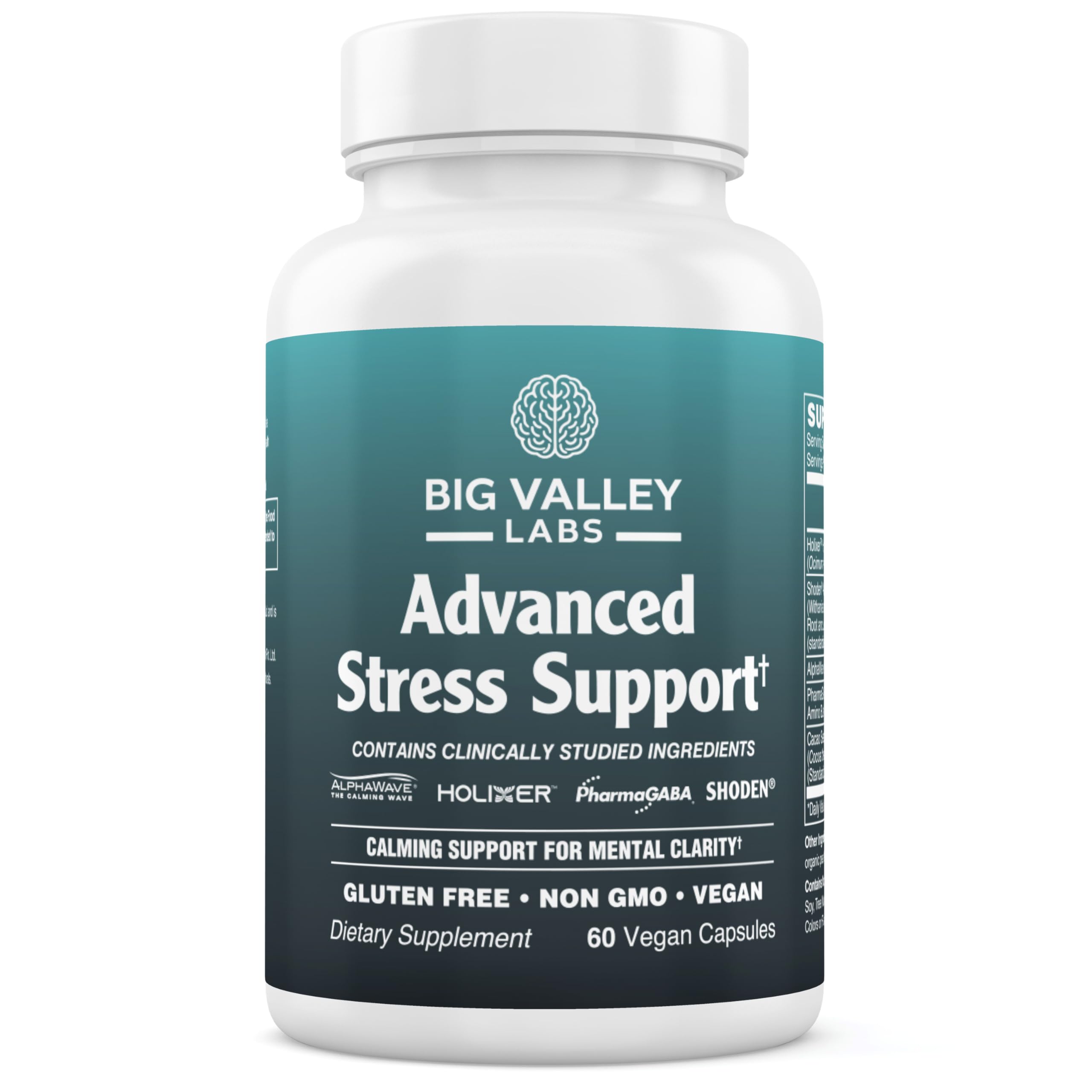 Big Valley Labs Advanced Stress Support Holy Basil Shoden Ashwagandha AlphaWave L-Theanine PharmaGABA Cacao Theobromine Calm & Clarity Formula Vegan Non-GMO Gluten-Free 60 Capsules