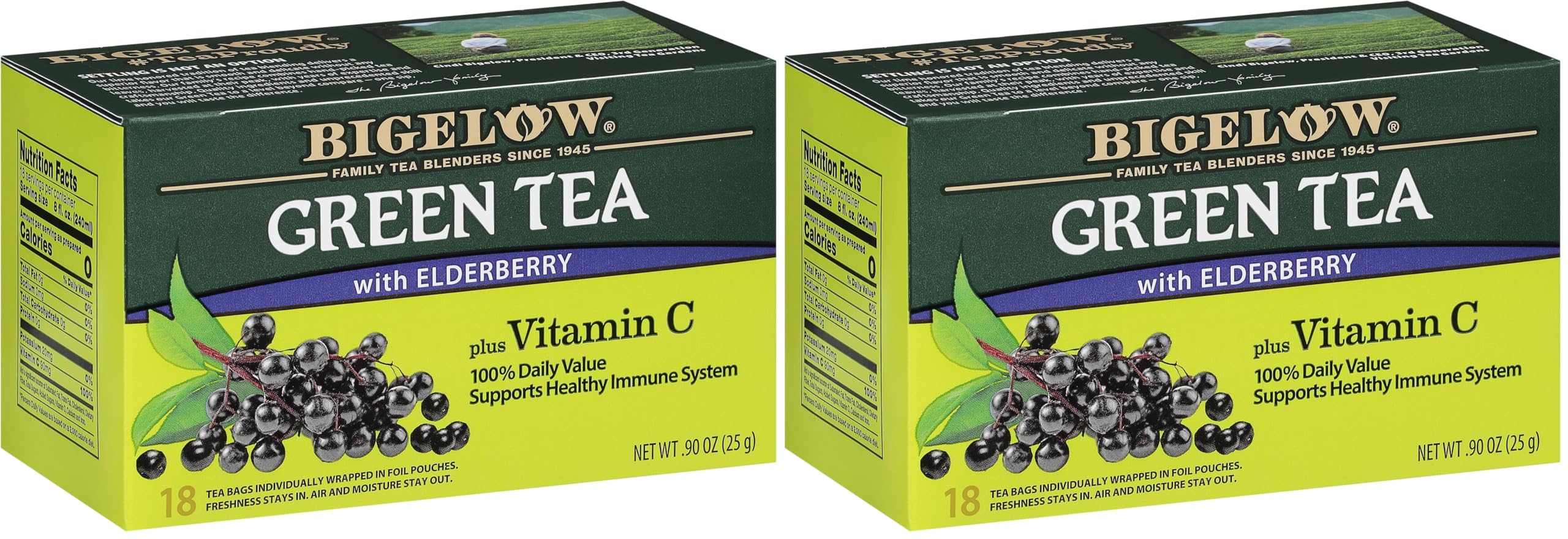 Uncompromised Quality: Since 1945, Bigelow Tea has been a leader in premium tea and proud to be a Certified B Corporation, meeting the highest standards of social and environmental impact. Blended and Packaged in the USA: In 1945, Ruth Campbell Bigelow created our first tea, Constant Comment, a strong, flavorful black tea blended with aromatic orange rind and sweet warming spice Bigelow is still 100 Family Owned today. Try A Variety Of Bigelow Tea Bags: There's a tea for morning, noon, and night time relaxation try Earl Grey Tea, Perfectly Mint Tea, Green Tea, decaffeinated teas, organic teas and a variety of herbal tea bags enjoyed as hot tea or iced tea. Tea Bags Individually Wrapped: Bigelow tea bags are gluten-free, calorie-free, Kosher Certified and come individually wrapped in foil pouches for peak flavor, freshness and aroma in a drink you can enjoy everywhere you go. Fruity and Tart: 18 tea bags of Bigelow Green Tea with Elderberry plus Vitamin C a bright tangy refreshing twist on smooth delicate green tea with the added benefit of antioxidant Vitamin C. The information below is per-pack only.