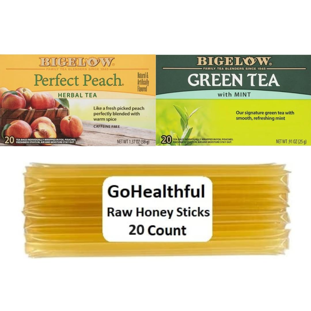 Bigelow Medicine Ball Cold Buster Tea Bundle, 20 Sachets Each (40 Total) of Bigelow Green Tea Mint and Perfect Peach Bundle with 20 GoHealthful Pure Raw Organic Clover Honey Sticks