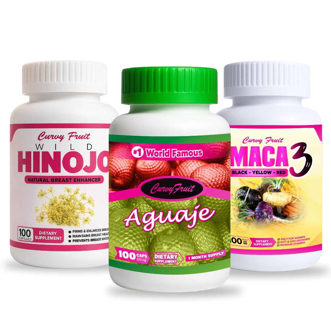 3 bottles – 100 capsules each – 1-month supply. 100 plant-based formula with no synthetic ingredients. Includes Red, Yellow Black Maca for total curve balance. Designed to support natural volume in hips, bust, and booty. 3-in-1 supplement with Aguaje, Maca 3, and Wild Hinojo.
