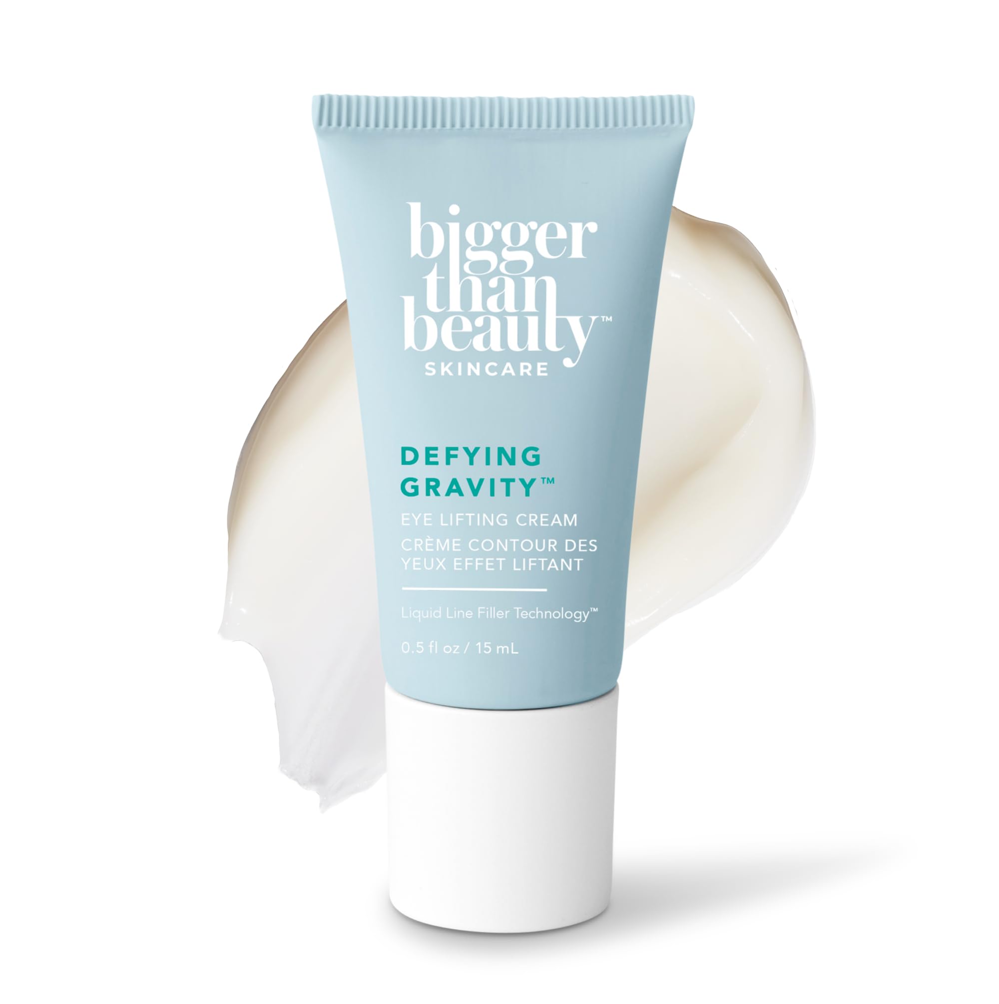 DISCOVER MORE FROM BIGGER THAN BEAUTY SKINCARE: Complete your skin care routine with other favorites from the collection, including cleansers, moisturizers, serums, sunscreens, masks, and lip care essentials. DAILY USE AND TRAVEL FRIENDLY: Packaged in a 0.5 fl oz (15 mL) size, this eye cream fits easily into your skincare routine at home or on the go. Use morning and night by gently tapping around the eye area for effortless hydration and a refreshed look that lasts throughout the day. REFRESHING TEXTURE AND FINISH: This lightweight cream absorbs quickly with a silky, comfortable feel that layers seamlessly under makeup. The hydrating texture gives the eye area a luminous, energized look without heaviness, making it ideal for morning or evening routines. MADE WITH PLANT BASED INGREDIENTS: Formulated with Line Filler Technology and Bio Power Retinol, a plant-derived retinol alternative, plus green tea, caffeine, and red algae extract to support hydration and elasticity. Rooibos leaf extract and allantoin help condition and protect skin. EYE LIFTING CREAM FOR EVERYDAY USE: A weightless eye cream that helps reduce the look of dark circles, puffiness, and fine lines while delivering hydration. Bigger Than Beauty Skincare Defying Gravity Eye Lifting Cream is designed for 360º use around the entire eye area. It supports smoother looking skin while helping eyes appear brighter and more refreshed with every application.