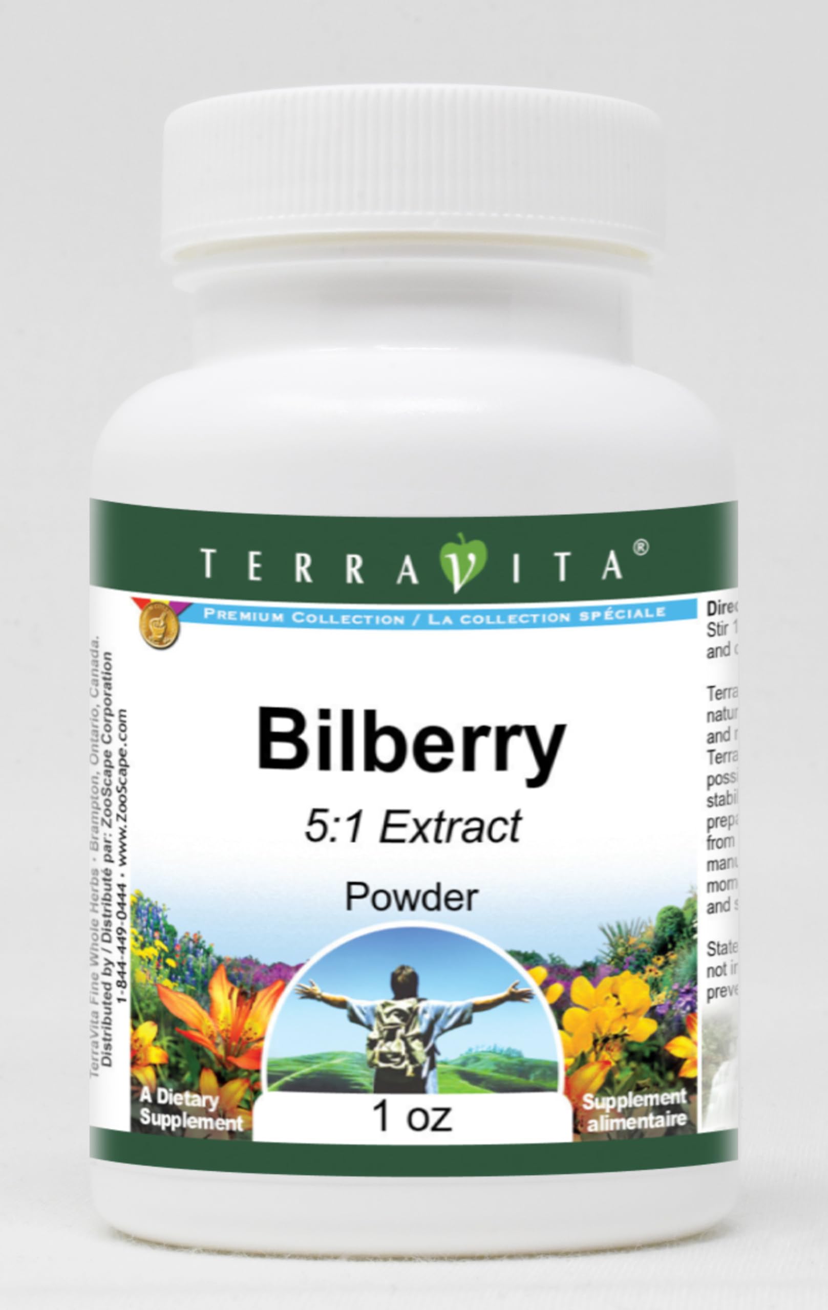 Convenient Powder format. Size: 1 oz. Manufacturer: TerraVita. No fillers. Bilberry 5:1 Powder (1 oz, ZIN: 519258).