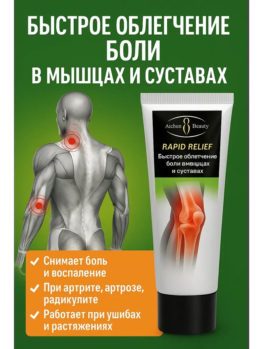 Крем Aichun Beauty Rapid Relief – это надёжный помощник для тех, кто ищет эффективное средство для суставов и мышц, которое поможет быстро снять боль, воспаление и восстановить подвижность. Подходит для домашнего использования, спортсменам, пожилым людям и всем, кто заботится о здоровье суставов.