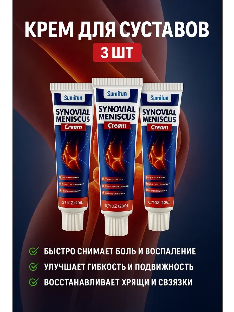 Крем для суставов Sumifun Synovial Meniscus Cream – эффективное обезболивающее средство на основе 36 натуральных китайских трав для здоровья суставов, коленей, связок и хрящей. Крем помогает при боли, воспалении, отёках, скованности движений и повреждениях суставов. Благодаря натуральному составу и активным экстрактам скорпиона, чёрного муравья, франкинсенса, имбиря, мяты и ангелики, крем проникает глубоко в ткани, снимает воспаление, стимулирует кровообращение и ускоряет восстановление суставных структур.