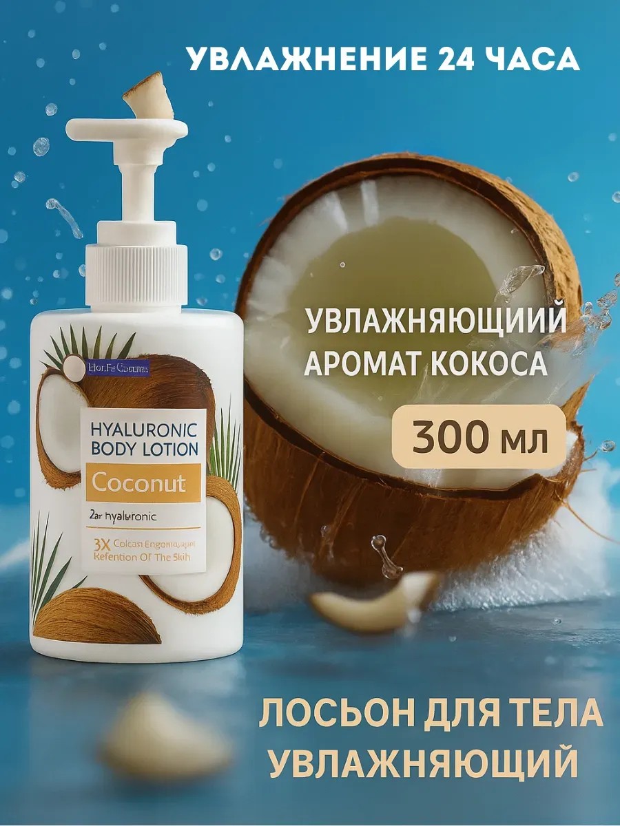 лосьон для тела, увлажняющий лосьон, кокосовый лосьон, лосьон с гиалуронкой, крем с кокосом, тропический лосьон, гиалуроновый крем, лосьон 300 мл, уход за телом, натуральный лосьон, без липкости, после душа, после загара, питание кожи, для сухой кожи, ароматный лосьон, гипоаллергенный