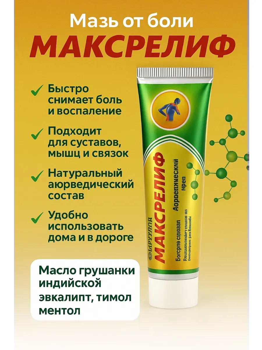 Аюрведическая мазь Максрелиф — надёжное средство для снятия боли, воспаления и усталости в суставах, мышцах и связках.