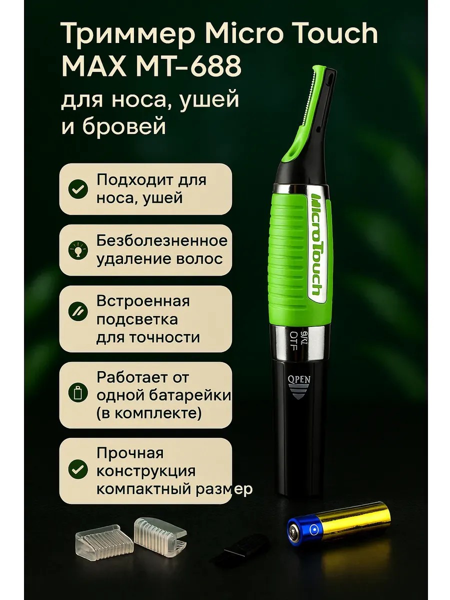 Многофункциональный персональный триммер Micro Touch MAX MT-688 — идеальное решение для ухода за собой в домашних условиях и в дороге. Компактный и удобный в использовании, он эффективно удаляет нежелательные волосы в самых деликатных зонах — нос, уши, брови, шея и бакенбарды.