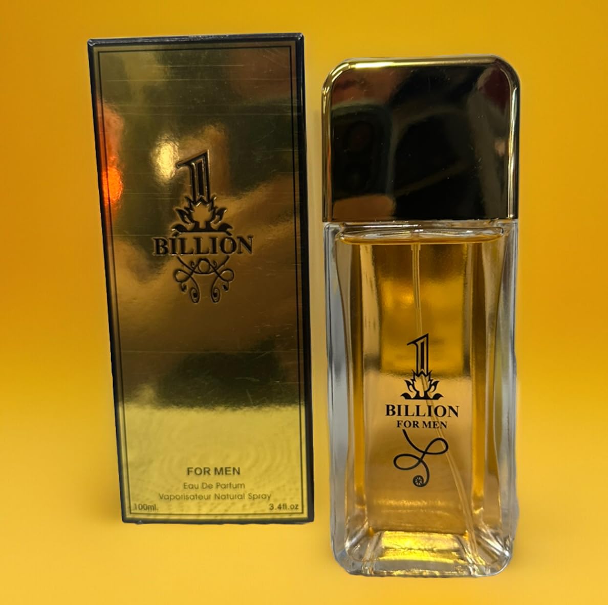 Introducing Billion For Men, an exquisite eau de parfum that embodies luxury and sophistication. This striking 3.4 fl oz (100ml) fragrance comes in an elegant glass bottle with clean, modern lines and a sophisticated gold-tinted finish. The matching metallic gold packaging creates a premium unboxing experience. The natural spray vaporizer ensures perfect application every time. The distinctive design features an artistic logo that combines the number '1' with decorative flourishes, making this a statement piece for any gentleman's grooming collection. Perfect for daily wear or special occasions, this refined scent makes an impressive gift or personal indulgence. The substantial bottle size provides long-lasting enjoyment of this distinguished fragrance. Mill. Smell