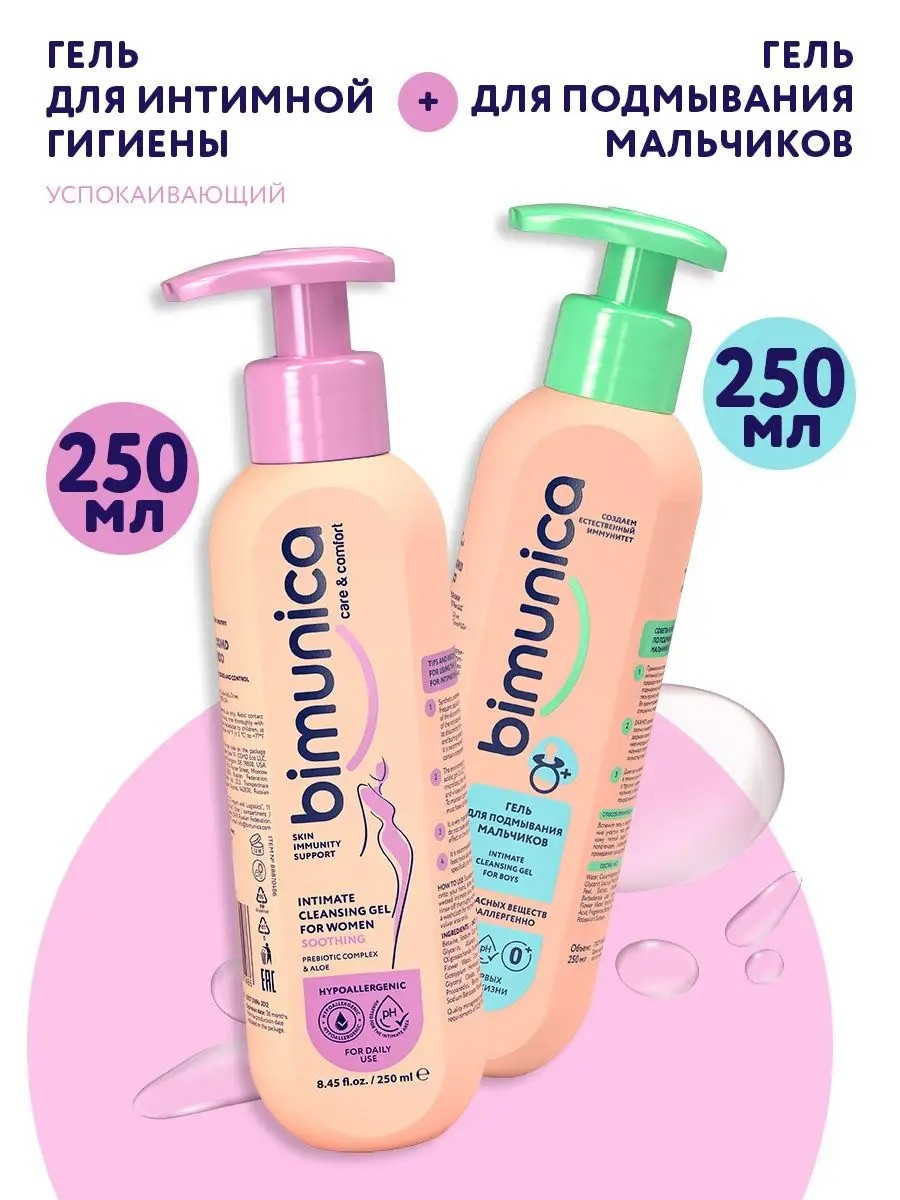 | Комплектация | Bimunica Гель для интимной гигиены женский успокаивающий, 250 мл - 1 шт; Bimunica Гель для подмывания мальчиков, 250 мл - 1 шт |