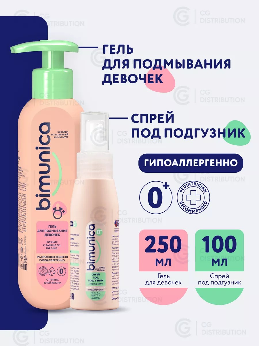 Детская косметика для новорожденными Bimunica: 1) Гель для подмывания девочек одно из лучших средств для интимной гигиены, разработан с учетом слабокислого рН микрофлоры с рождения и до полового созревания (до 10 лет). Гель для подмывания младенцев разработан специально для мягкого очищения интимной зоны. Средство для подмывания (гель для купания) содержит натуральные ингредиенты, которые снижают аллергические реакции, поддерживает естественную защиту кожи. 2) Средство спрей крем под подгузник ухаживает за кожей малышей в области подгузника, от опрелостей и от раздражений. Благодаря удобному распылителю детский крем не требует дополнительного распределения по коже, быстро впитывается. Аналог присыпка детская (присыпка для новорожденных), тальк. Крем под подгузник снижает аллергические реакции, защищает от внешних воздействий. Применять при каждой смене подгузника или по мере необходимости. НЕ СОДЕРЖАТ сульфаты; парабены; силиконы; красители; синтетические отдушки и минеральное масло.