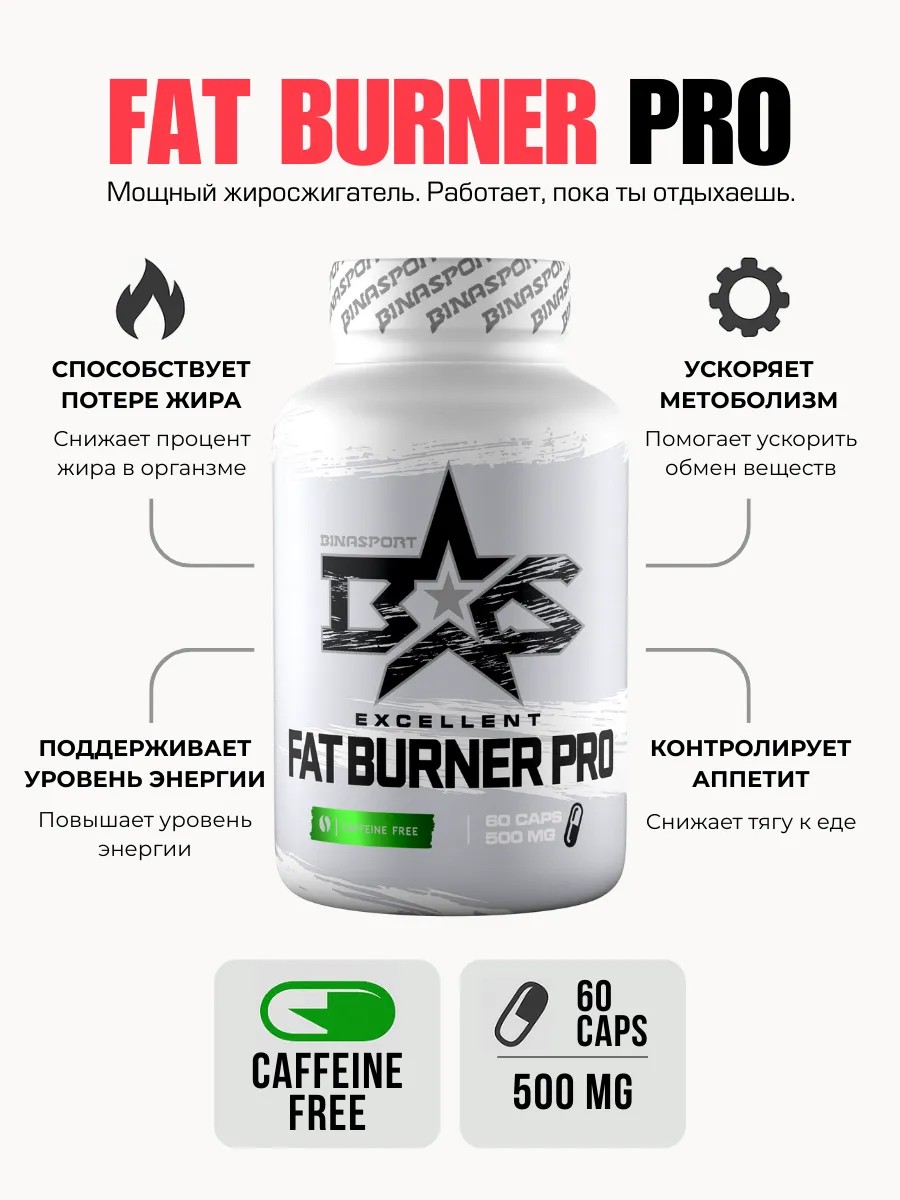 Представьте себе, как вы легко и без усилий достигаете своих целей по снижению веса! Жиросжигатель Экселент Фат Бернер Про 60 от Binasport — ваш надежный помощник в этом увлекательном путешествии. Этот эффективный и мощный жиросжигатель, созданный из только разрешенных ингредиентов, поможет вам избавиться от лишних килограммов мягко и без побочных эффектов. Благодаря уникальной многокомпонентной формуле, включающей L-карнитин, таурин, альфа-липоевую кислоту и экстракты целебных растений, он не только подавляет аппетит, но и способствует улучшению липидного профиля крови, повышает уровень гемоглобина и дарит вам заряд энергии для активной жизни. Экселент Фат Бернер Про 60 прошел строгие лабораторные исследования и испытания, имеет СГР и гарантирует вам высокое качество и безопасность. Сделайте первый шаг к своей новой, стройной версии себя уже сегодня!