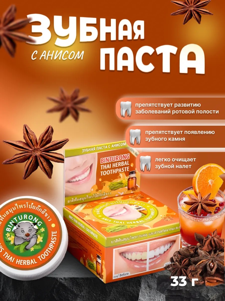 Зубная паста Anis Thai Herbal — ваш секрет белоснежной улыбки и свежего дыхания! Эта отбеливающая зубная паста с анисом и эвкалиптом эффективно борется с желтым налетом, надолго освежает дыхание, снимает воспаления и защищает от кариеса, не повреждая зубную эмаль. Одной баночки хватит на 3 месяца регулярного использования.