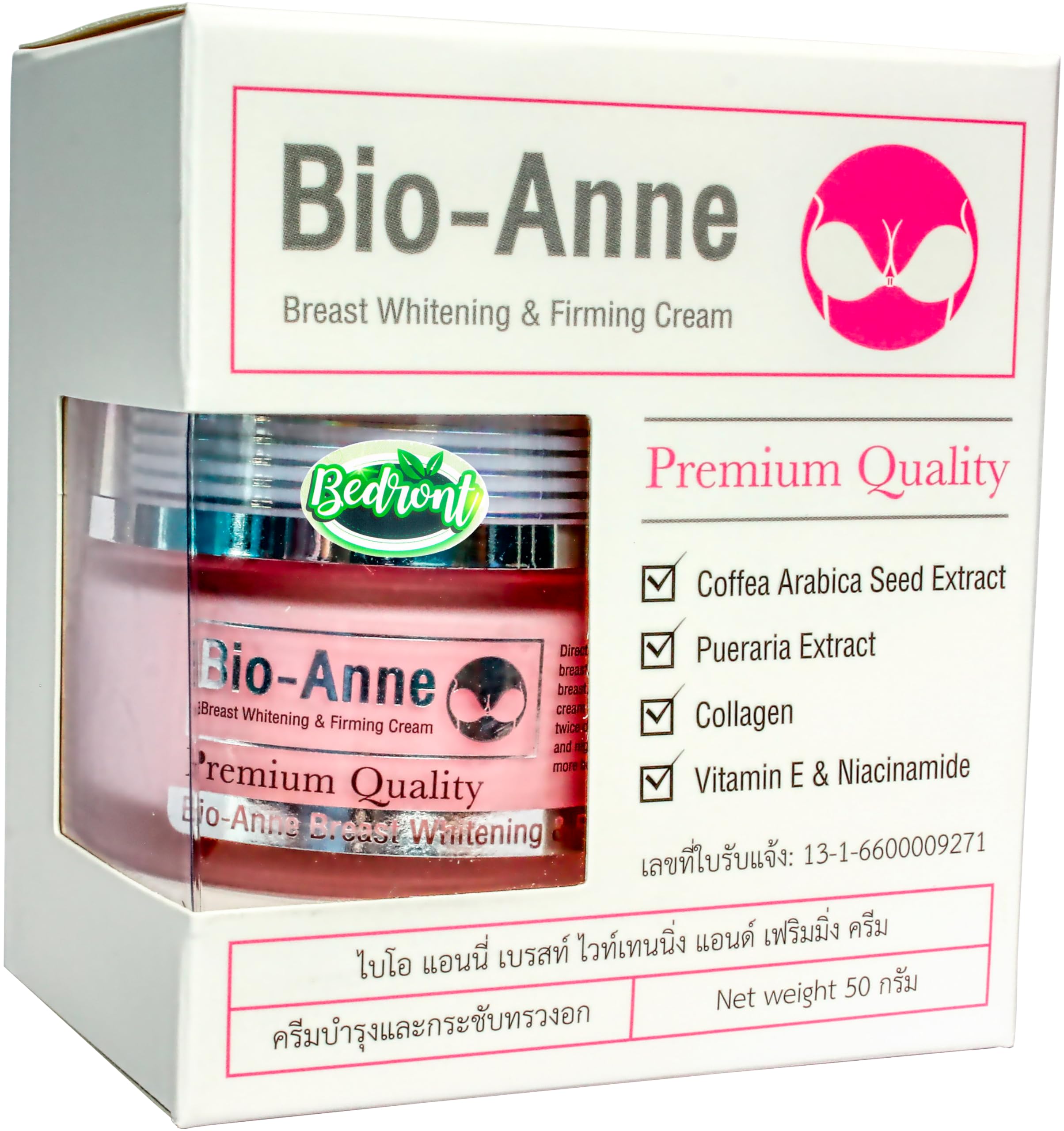 Bio-Anne Breast Enlarging and Firming Bio-active Cream with Pueraria Mirifica and Collagen, Made in Thailand. Guaranteed Result. Super formula. 100 natural. Quickly 99 up guaranteed. BIO-ANNE Bio-Active Cream is formulated from the natural Pueraria Mirifica collagen to enlarge the size of breast. It is specially formulated to help firm and tighten the skin in the breast area. Those who have used BIO-ANNE Bio-Active Cream have quickly and naturally increased bust size as well as gained firmness and tightness. As a result, BIO-ANNE has been effective in over 99 of women who have used it! You will see an appreciable improvement within 1 week. Directions. Apply some cream on the breasts and gently massage into each breast, especially at the base until the cream is completely absorbed. Use twice daily, after shower in the morning and night for a firmer, tighter and fuller, more beautiful breasts. Ingredients. Purified water, propylene glycol, lactic acid, mineral oil, glyceryl monostearate, vegetable glycerine, pueraria extract, hydrolized collagen, avocado oil, sesame oil, sweet almond oil, vitamin E, methylparaben, fragrance. Net weight: 50 grams Shelf life: 3 years Manufactured and distributed by Bedront LLC Bio-Anne Breast Enlarging and Firming Bio-active Cream with Pueraria Mirifica and Collagen, Made in Thailand. Guaranteed Result. Super formula. 100 natural. Quickly 99 up guaranteed. BIO-ANNE Bio-Active Cream is formulated from the natural Pueraria Mirifica collagen to enlarge the size of breast. It is specially formulated to help firm and tighten the skin in the breast area. Those who have used BIO-ANNE Bio-Active Cream have quickly and naturally increased bust size as well as gained firmness and tightness. As a result, BIO-ANNE has been effective in over 99 of women who have used it! You will see an appreciable improvement within 1 week. Directions. Apply some cream on the breasts and gently massage into each breast, especially at the base until the cream is completely absorbed. Use twice daily, after shower in the morning and night for a firmer, tighter and fuller, more beautiful breasts. Ingredients. Purified water, propylene glycol, lactic acid, mineral oil, glyceryl monostearate, vegetable glycerine, pueraria extract, hydrolized collagen, avocado oil, sesame oil, sweet almond oil, vitamin E, methylparaben, fragrance. Net weight: 50 grams Shelf life: 3 years Manufactured and distributed by Bedront LLCTrusted Brand: Manufactured and distributed by reputable J K INTER NATURAL CO.,LTD. based in Bangkok, Thailand. Visible Results: Users can expect noticeable increase in bust size as well as improved firmness and tightening. Simple Application: Apply a moderate amount to the breast area 1-2 times daily, gently massaging until fully absorbed. Proven Effectiveness: Over 99 of users have reported appreciable improvement in breast size and firmness within just 1 week of using this Bio-Active Cream. Natural Ingredients: This breast enlarging and firming cream is formulated with Pueraria and Collagen to naturally enhance bust size and tighten skin in the breast area.