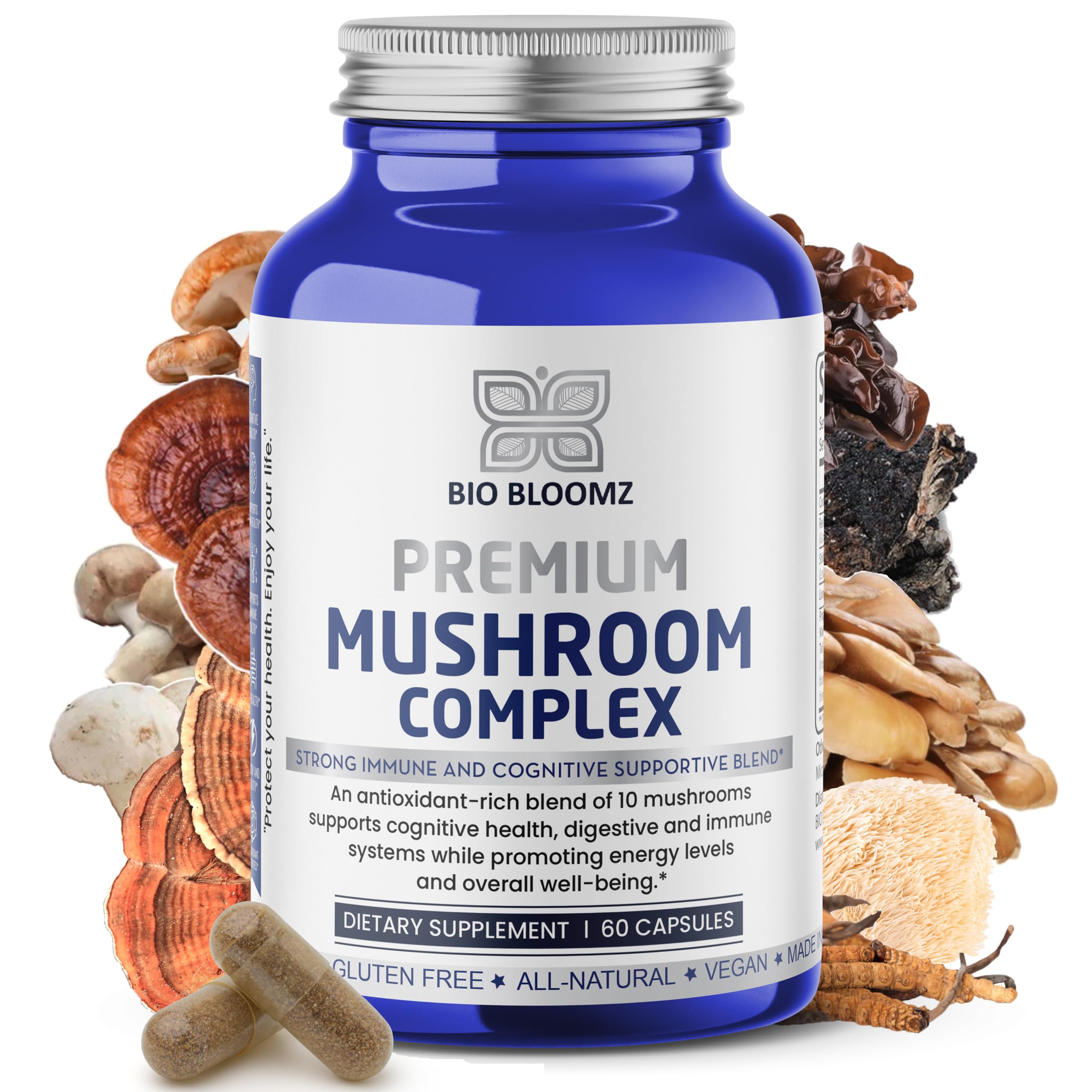 BIO Bloomz Premium Mushroom Complex Capsules - Lion's Mane Supplement Wellness Formula with Turkey Tail, Shiitake, Cordyceps, Reishi, Chaga, Maitake - Immune Support Mushrooms Herbal Supplements - 60