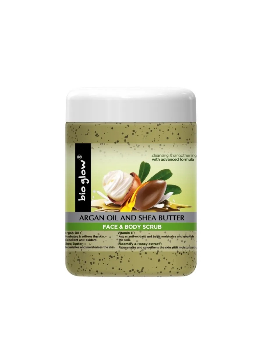 Bio Glow Argan Oil and Shea Butter Face and Body Scrub with argan oil and shea butter, 500 ml, 1 piece. Bio Glow Argan Oil and Shea Butter Face and Body Scrub with argan oil, shea butter, vitamin E, and rosemary and honey extracts. Gently cleanses, gently exfoliates, and smoothes the skin. Moisturizes, nourishes, and firms.