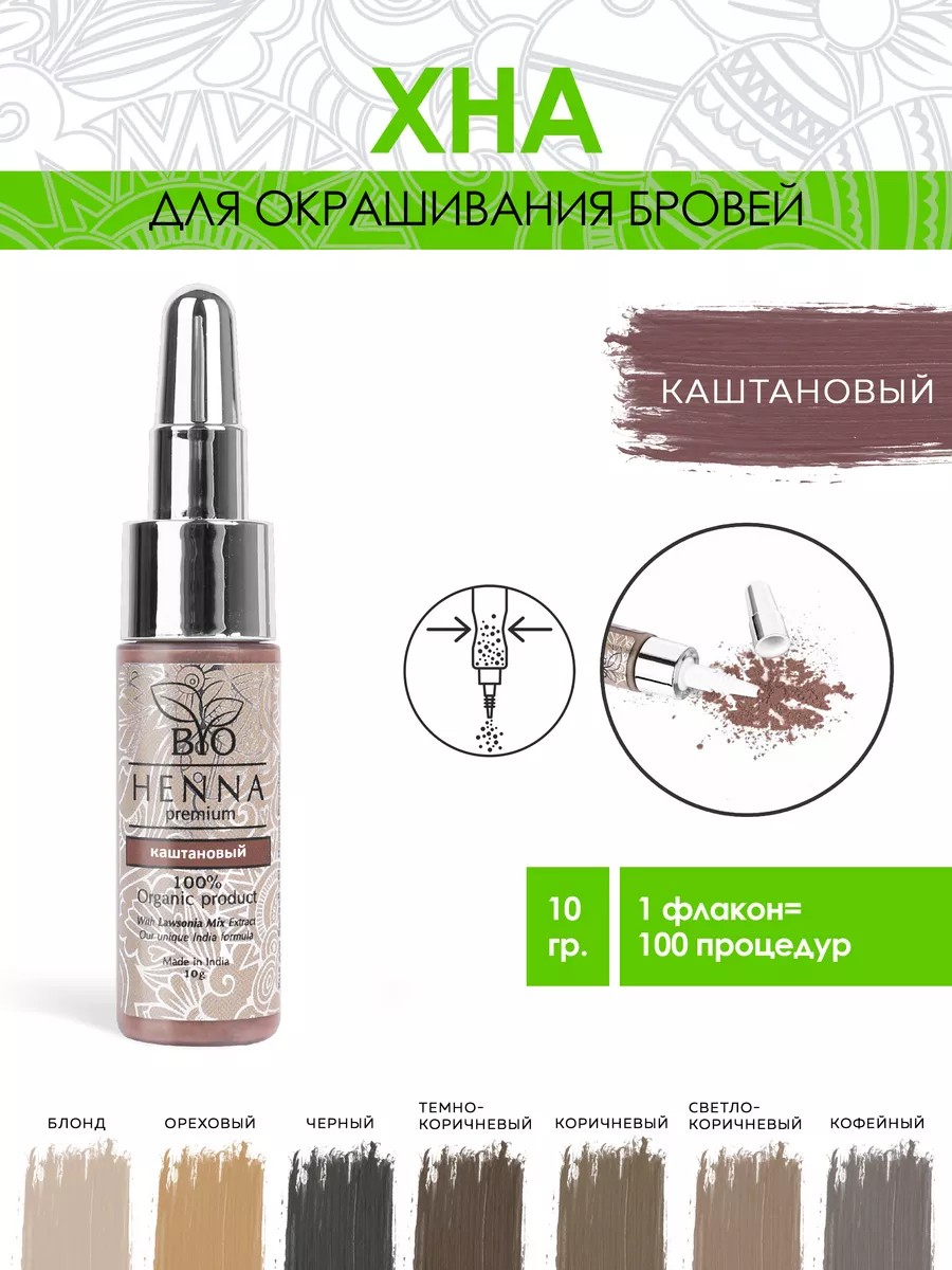 Bio Henna Premium-это натуральная хна,предназначенная для окрашивания бровей и ресниц с эффектом биотатуажа.Наш продукт обеспечивает стойкое окрашивание на коже в течение 7-10 дней, а волоски остаются окрашенными до 3-4 недель.Основным компонентом хны являются листья лавсонии, которые оказывают положительное воздействие на волосы, делая их пышными и блестящими.Флакона 10 гр хны, достаточно для проведения 30-40 процедур.Благодаря мягкому флакону и удобному носику-дозатору, использование хны становится очень комфортным, а также обеспечивает долгий срок хранения продукта.Основным преимуществом нашей хны является то, что она не меняет свой оттенок после окрашивания, достаточно всего лишь использовать масло усьмы для закрепления цвета.Наши продукты подходят как для новичков, так и для профессионалов .Мы предлагаем широкую палитру, включающую 8 оттенков:кофейный,темно-коричневый,ореховый,коричневый,блонд,светло-коричневый,черный и каштановый.Окрашивание выглядит естественно и каждая девушка сможет найти подходящий оттенок в соответствии с ее цветотипом лица.В карточке товара вы найдете фото по колористике и видео-инструкцию по окрашиванию бровей,что значительно облегчит процесс. Профессиональная хна для бровей и краска для бровей подходит для обладательниц русого цвета волос, а также для блондинок и брюнеток.Светлый пигмент на темных бровях создаст легкий осветляющий эффект, который будет безопасным и нежным.Перед началом окрашивания необходимо развести хну в минеральной воде, следует избегать использования металлической емкости и предпочтение отдавать пластиковой или стеклянной емкости.Также рекомендуется провести полную процедуру очищения бровей с использованием скраба, шампуня и обезжиривателя для достижения длительного эффекта окрашивания.В нашем магазине вы также найдете набор для бровей , краску для бровей, включая пасту, скраб для бровей, линейку для бровей, трафареты.