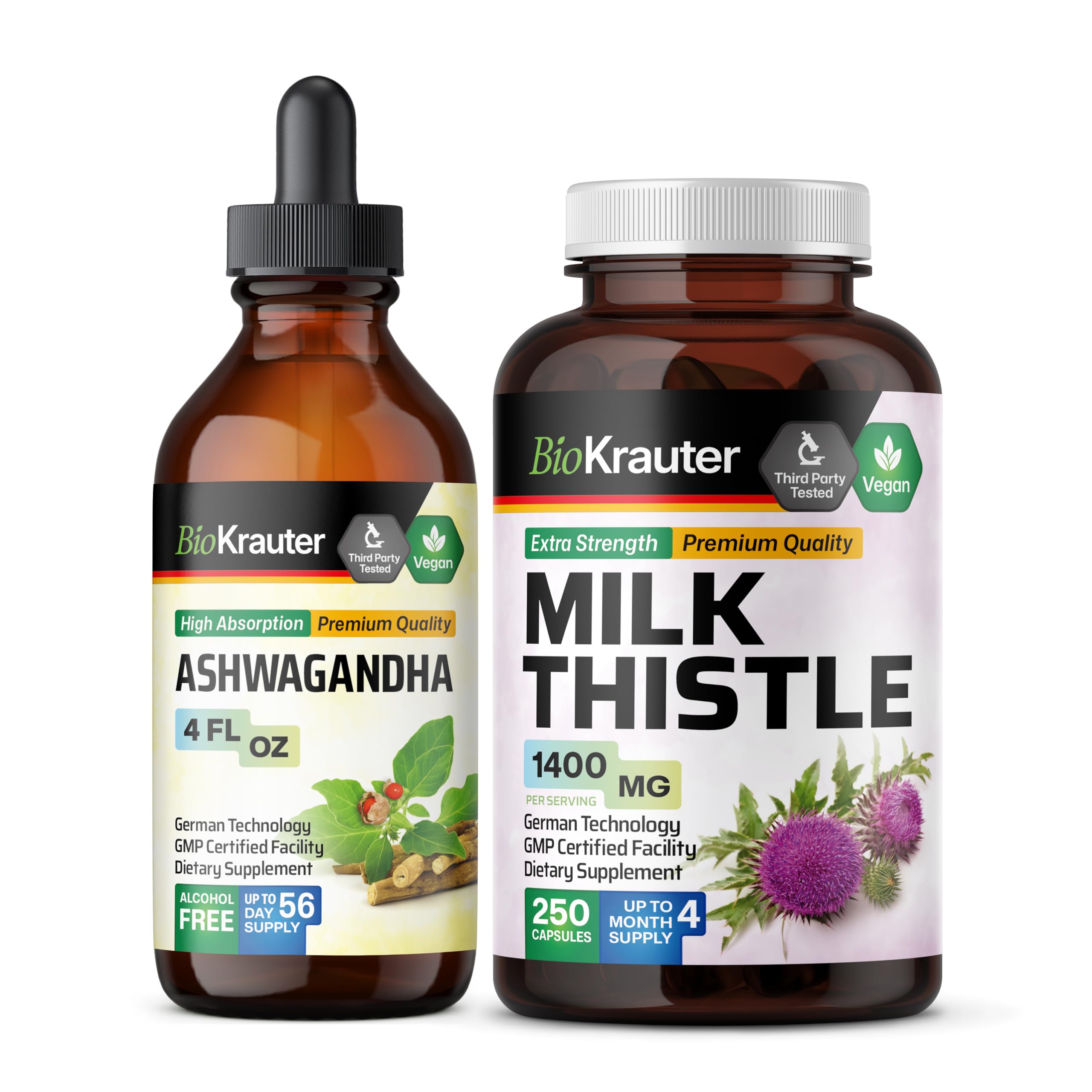 BIO KRAUTER Ashwagandha Tincture 4 Fl. Oz. & Milk Thistle 250 Capsules