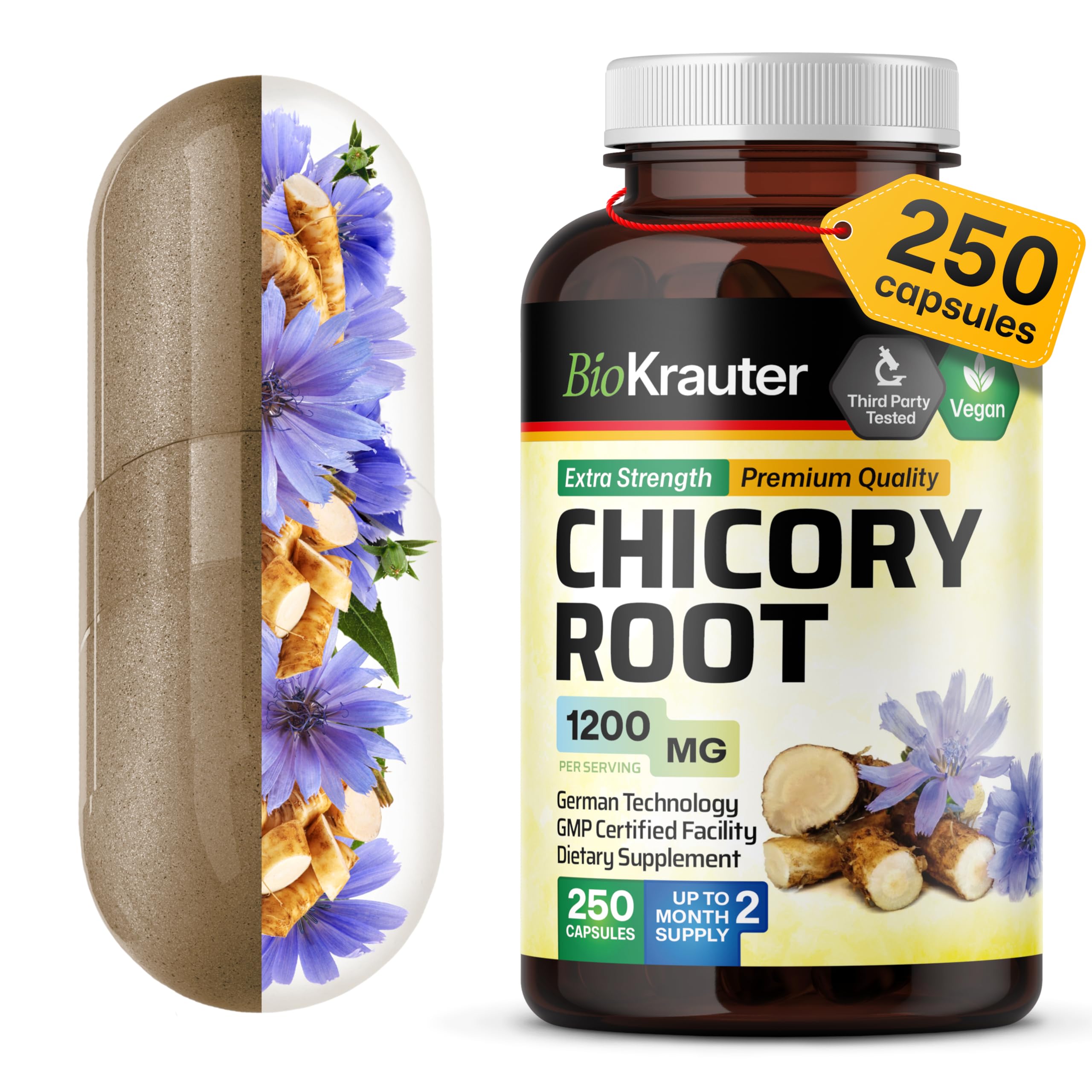 BIO KRAUTER Chicory Root for Gut & Digestive Support - Pure Vegan Prebiotics & Fiber Supplement in Capsules 1200 mg per Serving 250 Count - No Fillers Non-GMO - 62 Days of Supply 250 Count (Pack of 1)