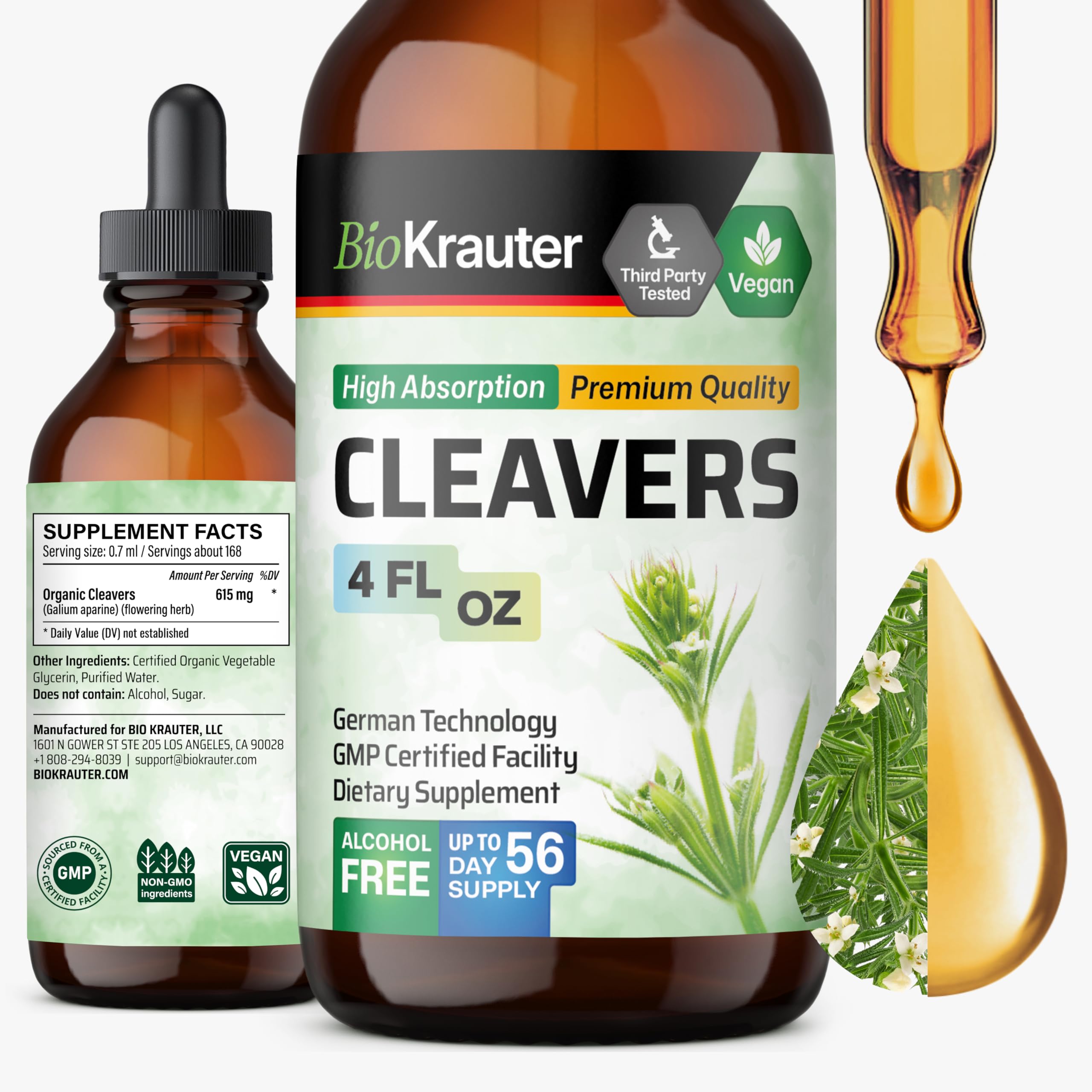 Usage Instructions: Shake well before use. Our cleavers tincture is easy to use—simply add a few cleavers drops to your favorite beverage or directly under the tongue. Avoid touching the dropper with your lips or tongue. German Technology: We utilize German technology to craft cleavers herb drops that naturally and effectively support your health. Made with only three simple ingredients: water, glycerin, and cleavers leaf—this formula provides up to 98 absorption. No Bitter Taste: Our cleavers liquid extract is crafted with glycerin, which naturally eliminates bitterness, ensuring a smooth and pleasant flavor without the need for any added sugars. Vegan Non-alcohol: Our cleavers herb tincture formula is vegan, non-GMO, and free from alcohol, artificial colors, and flavors, designed to align with a wide range of lifestyles. Cleaver Herb Tincture for Detoxification: BioKrauter cleaver tincture, made from Galium aparine (commonly known as cleavers leaf), supports cleanse and detox. It's good for those who struggle with swallowing cleavers capsules.