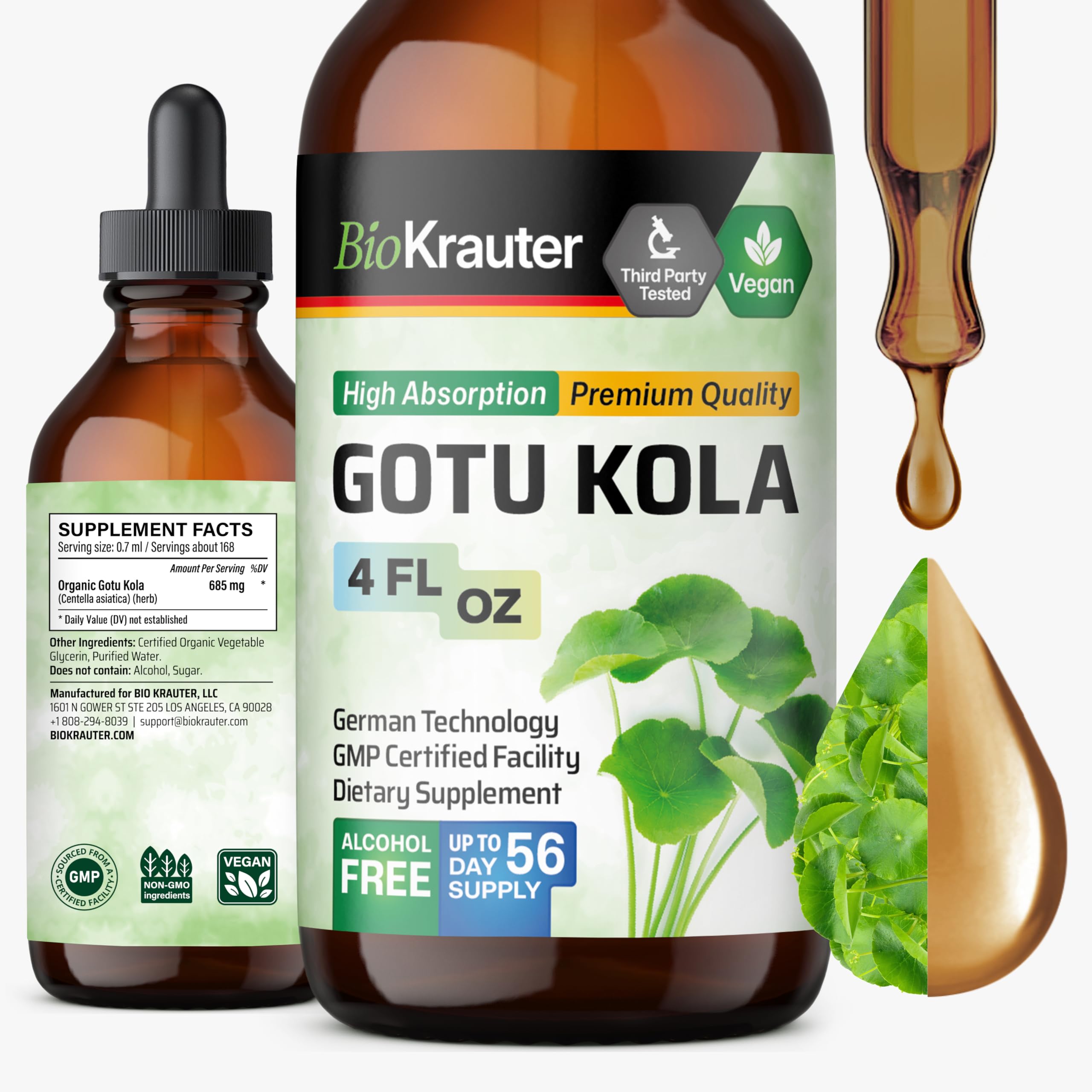 56 Days of Supply (Up to 2 Months): 4 fl oz bottle of memory supplements contains 168 servings (1 serving 650 mg of liquid gotu kola herb). Shake well before use. Add one (1) full squeeze of the gotu kola tea to 2 oz. of water or juice, three times daily. Pure Formula: Crafted with only three simple ingredients: water, glycerin, and gotu kola powder - this formula provides up to 98 absorption. Made in the USA with globally sourced ingredients. No Bitter Taste: Gotu kola tincture by BioKrauter is crafted with glycerin, which naturally eliminates bitterness, ensuring a smooth and pleasant flavor without the need for any added sugars. Vegan Non-alcohol: Our gotu kola supplement is vegan, non-GMO, and free from alcohol, artificial colors, and flavors, designed to align with a wide range of lifestyles. Brain Support Supplement: BioKrauter gotukola made from Centella asiatica (herb), traditionally used to help support normal memory function, focus, and overall brain health.