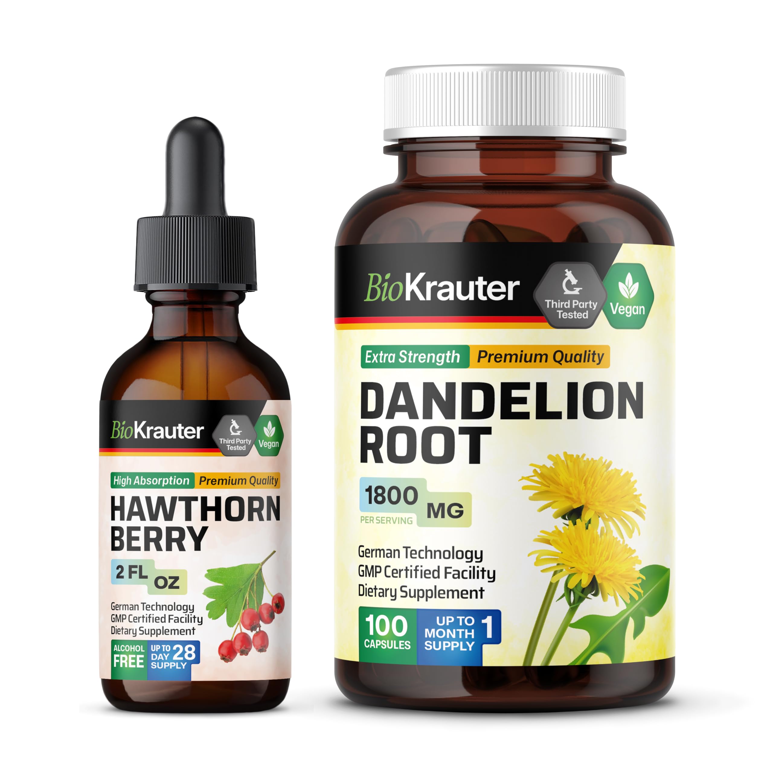 BIO KRAUTER Hawthorn Tincture 2 Fl. Oz. & Dandelion 100 Capsules