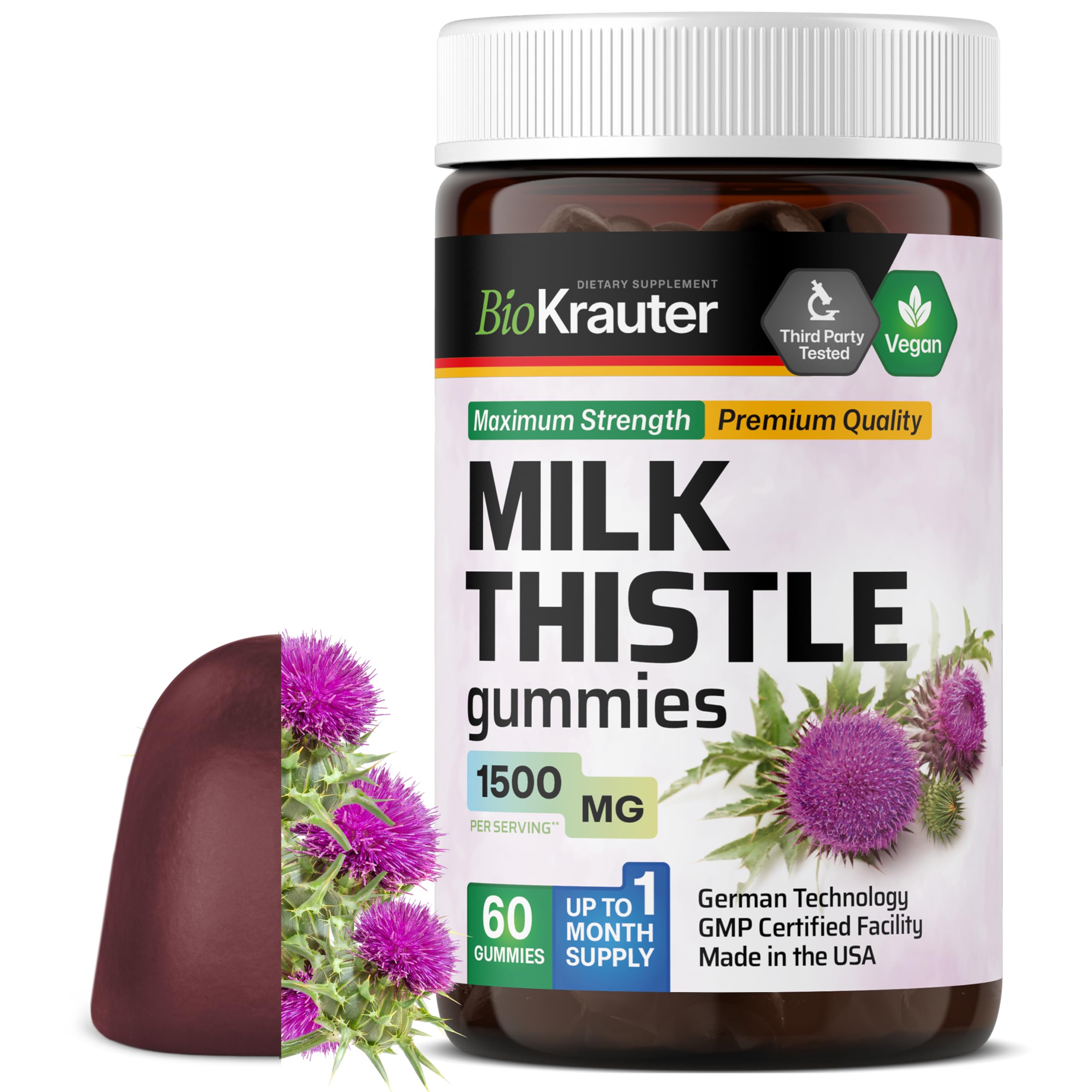 BIO KRAUTER Milk Thistle Liver Detox Gummies - 1500 mg Strength - 60 Chews - Silymarin Milk Thisle Supplement - Vegan Gelatine-Free Formula
