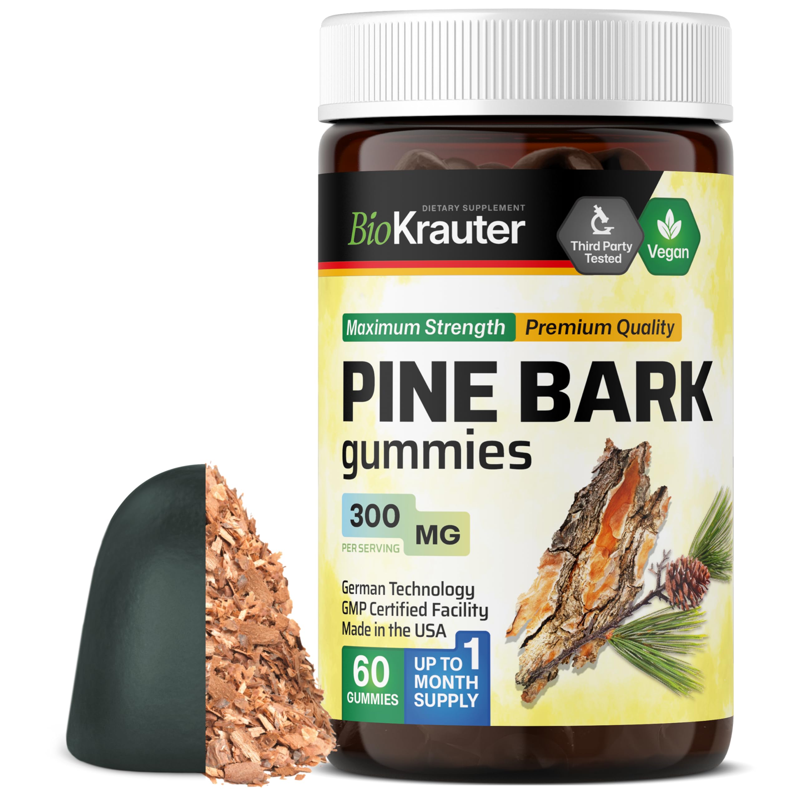 BIO KRAUTER Pine Bark Extract Gummies - 300 mg Strength - 60 Vegan Chews - French Maritime Pine Bark Extract - Antioxidant Supplement - 95% Proanthocyanidins - Pectin-Based Formula