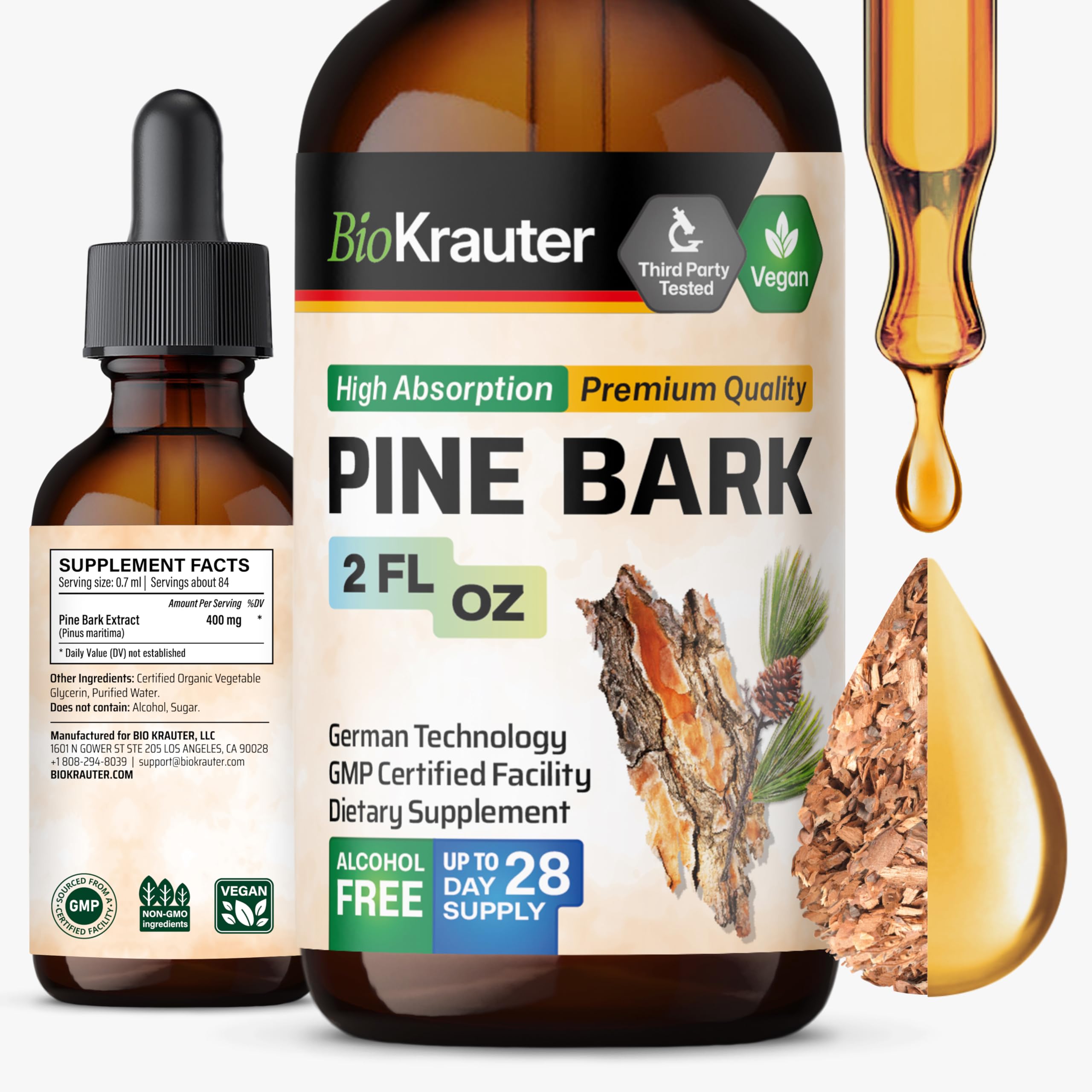 Usage Instructions: Shake well before use. Our pine bark extract is easy to use—simply add a few pine bark drops to your favorite beverage or directly under the tongue. Avoid touching the dropper with your lips or tongue. German Technology: We utilize German technology to craft French maritime pine bark extract drops that naturally support your health. Made with only three simple ingredients: water, glycerin, and pine bark—this formula provides up to 98 absorption. No Bitter Taste: Our pine bark extract drops are crafted with glycerin, which naturally eliminates bitterness, ensuring a smooth and pleasant flavor without the need for any added sugars. Vegan Non-alcohol: Our pine bark liquid formula is vegan, non-GMO, and free from alcohol, artificial colors, and flavors, designed to align with a wide range of lifestyles. Pine Bark Tincture for Overall Health: BioKrauter Pine bark extracts tincture, made from Pinus maritima (commonly known as pine bark), supports overall health by promoting antioxidant defense.