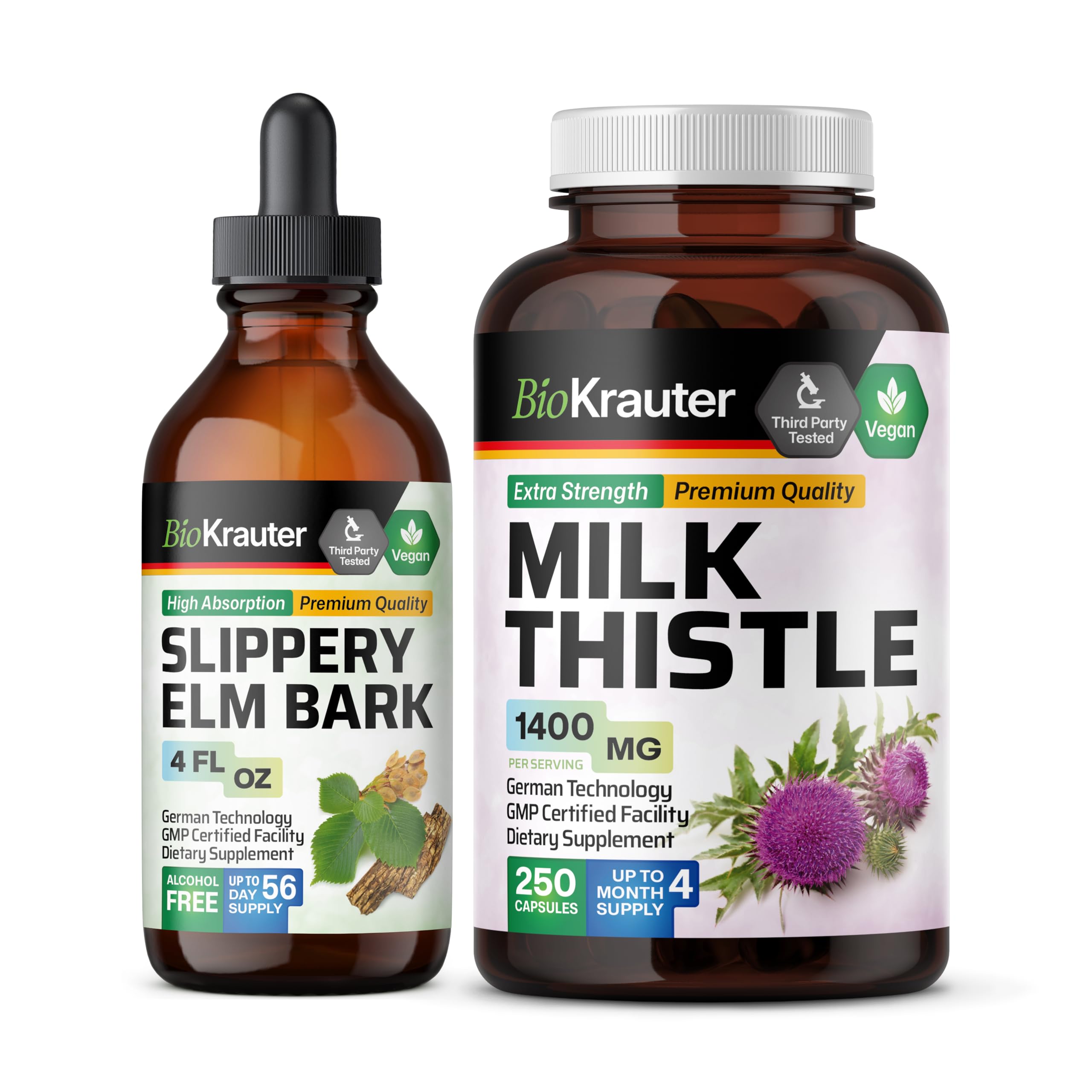 BIO KRAUTER Slippery Elm Tincture 4 Fl. Oz. & Milk Thistle 250 Capsules