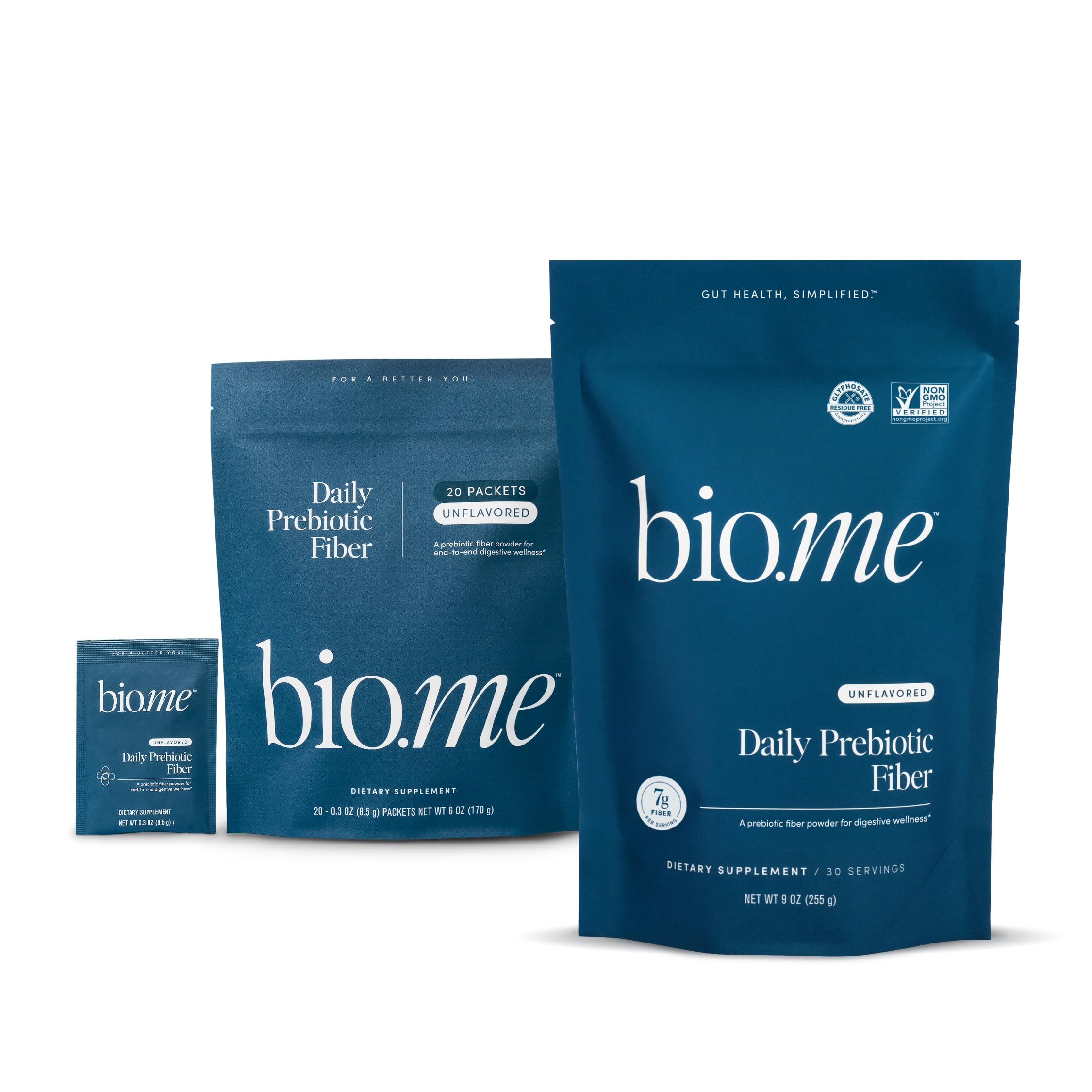 CLEAN CERTIFIED GLYPHOSATE RESIDUE FREE: Committed to quality, Bio.me Daily Prebiotic Fiber is certified Glyphosate Residue Free, non-GMO, dairy free, gluten free, and vegan. This dietary fiber supplement is also low FODMAP certified, making it a safe and healthy choice for everyone seeking to making their digestive health better with integrity and reliability. VERSATILE AND CONVENIENT FOR DAILY OR ON-THE-GO USE: Bio.me's unflavored prebiotic fiber powder comes in both full-size and travel pack formats for easy support anywhere. This tasteless powder dissolves smoothly into hot or cold drinks, smoothies, and foods, no prep or flavor adjustments needed. BLOATING RELIEF: No more stomach discomfort with our unflavored prebiotic fiber powder. This soluble fiber supplement is designed to ease bloating and promote regularity. Its slow-fermenting fibers gently nourish your gut bacteria, enhancing digestion without the unpleasant side effects of bloating or cramping, making it a superior choice among fiber supplements. BETTER GUT HEALTH: Bio.me's fiber powder is a unique blend of plant-derived resistant potato starch and hydrolyzed guar gum (PHGG), specifically formulated to boost your gut health. These prebiotics help promote the growth of beneficial bacteria, improve nutrient absorption, and support a healthy gut lining. Ideal as a daily use fiber supplement for women and men, it's your partner in achieving optimal digestive wellness. DAILY AND TRAVEL-FRIENDLY DIGESTIVE SUPPORT: This includes Bio.me Daily Prebiotic Fiber in both full-size and travel packs, offering flexible digestive support at home or on the go. Each serving delivers 7g of soluble fiber from two clinically researched prebiotics to help maintain a balanced microbiome, without bloating, gas, or cramping.