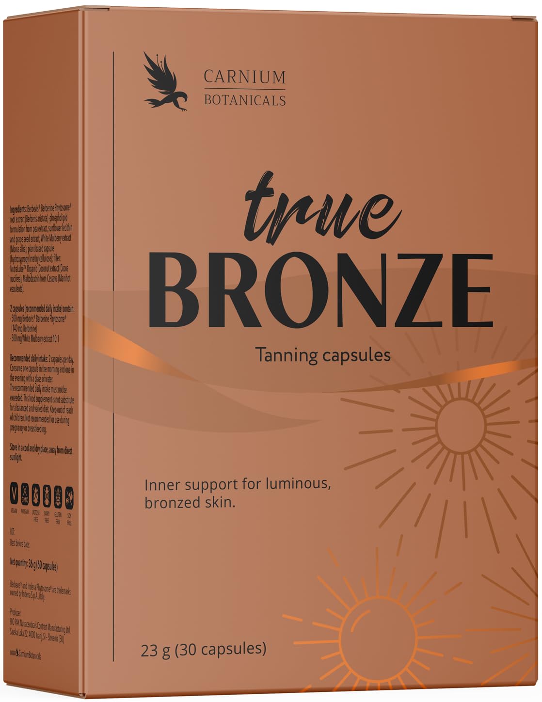 Astaxanthin Vitamin A – Dietary supplement with astaxanthin and vitamin A vitamin A contributes to the maintenance of normal skin. Beta-carotene Lycopene – Bronzing capsules with beta-carotene and lycopene, natural plant pigments that contribute to an even, natural complexion. High-dose Carotene Capsules – Formula with concentrated carotenoids, ideal as a beta-carotene supplement for a long-lasting natural tan. Skincare Beauty – Vegan, gluten-free, lactose-free and without added sugars suitable for daily use. Carnium Botanicals Quality – Tanning supplement with controlled raw materials, fresh production and transparent processes for reliable results. INGREDIENTS 1 capsule contains: lycopene 15 mg, astaxanthin 8 mg, beta-carotene 8 mg, of which vitamin A 1333 µgCarnium Botanicals Quality – Tanning supplement with controlled raw materials, fresh production and transparent processes for reliable results. Skincare Beauty – Vegan, gluten-free, lactose-free and without added sugars suitable for daily use. High-dose Carotene Capsules – Formula with concentrated carotenoids, ideal as a beta-carotene supplement for a long-lasting natural tan. Beta-carotene Lycopene – Bronzing capsules with beta-carotene and lycopene, natural plant pigments that contribute to an even, natural complexion. Astaxanthin Vitamin A – Dietary supplement with astaxanthin and vitamin A vitamin A contributes to the maintenance of normal skin.Carnium Botanicals True BRONZE – Bronzingscapsules met astaxanthine, bètacaroteen en vitamine A – Caroteencapsules voor huid teint – 30 capsules Astaxanthine Vitamine A – Voedingssupplement met astaxanthine en vitamine A vitamine A draagt bij tot het behoud van een normale huid. Bètacaroteen Lycopene – Bronzingscapsules met bètacaroteen en lycopeen, natuurlijke plantaardige pigmenten die bijdragen aan een egale, natuurlijke teint. Hooggedoseerde Caroteencapsules – Formule met geconcentreerde carotenoïden, ideaal als bètacaroteen-supplement voor een langdurige natuurlijke bruine kleur. Huidverzorging Schoonheid – Vegan, glutenvrij, lactosevrij en zonder toegevoegde suikers geschikt voor dagelijks gebruik. Carnium Botanicals Kwaliteit – Zonnebruiningssupplement met gecontroleerde grondstoffen, verse productie en transparante processen voor betrouwbare resultaten. INGREDIËNTEN 1 capsule bevat: lycopeen 15 mg, astaxanthine 8 mg, bètacaroteen 8 mg, waarvan vitamine A 1333 µgCarnium Botanicals Kwaliteit – Zonnebruiningssupplement met gecontroleerde grondstoffen, verse productie en transparante processen voor betrouwbare resultaten. Huidverzorging Schoonheid – Vegan, glutenvrij, lactosevrij en zonder toegevoegde suikers geschikt voor dagelijks gebruik. Hooggedoseerde Caroteencapsules – Formule met geconcentreerde carotenoïden, ideaal als bètacaroteen-supplement voor een langdurige natuurlijke bruine kleur. Bètacaroteen Lycopene – Bronzingscapsules met bètacaroteen en lycopeen, natuurlijke plantaardige pigmenten die bijdragen aan een egale, natuurlijke teint. Astaxanthine Vitamine A – Voedingssupplement met astaxanthine en vitamine A vitamine A draagt bij tot het behoud van een normale huid.