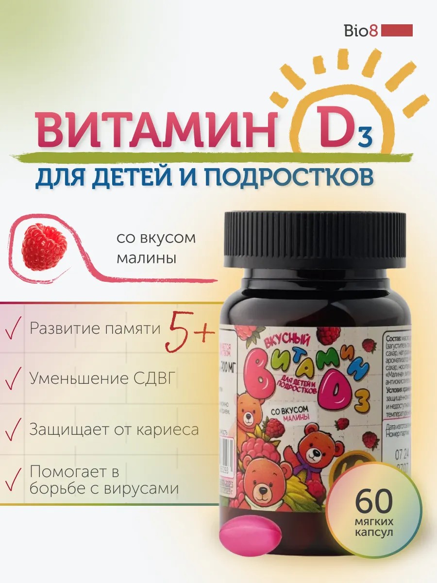 Bio8 Витамин Д3 для детей, мармеладки со вкусом малины, 60 штук
