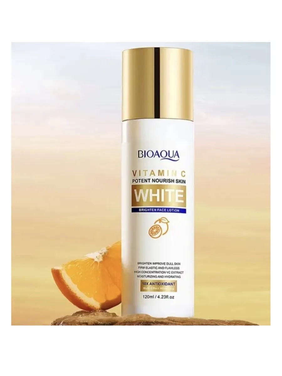 BIOAQUA Vitamin C White Brighten Facial Lotion is designed to brighten, nourish, and moisturize the skin. This vitamin C facial lotion is ideal for brightening and evening out skin tone. Thanks to its high concentration of vitamin C, it helps reduce the appearance of age spots and acne scars, restoring skin's natural radiance. The antioxidant properties of vitamin C protect the skin from free radical damage, keeping it youthful and supple. The light, refreshing formula instantly hydrates, leaving skin looking healthy and prepared for the next steps of your skincare routine. Suitable for all skin types, it leaves you feeling fresh and well-groomed every day.