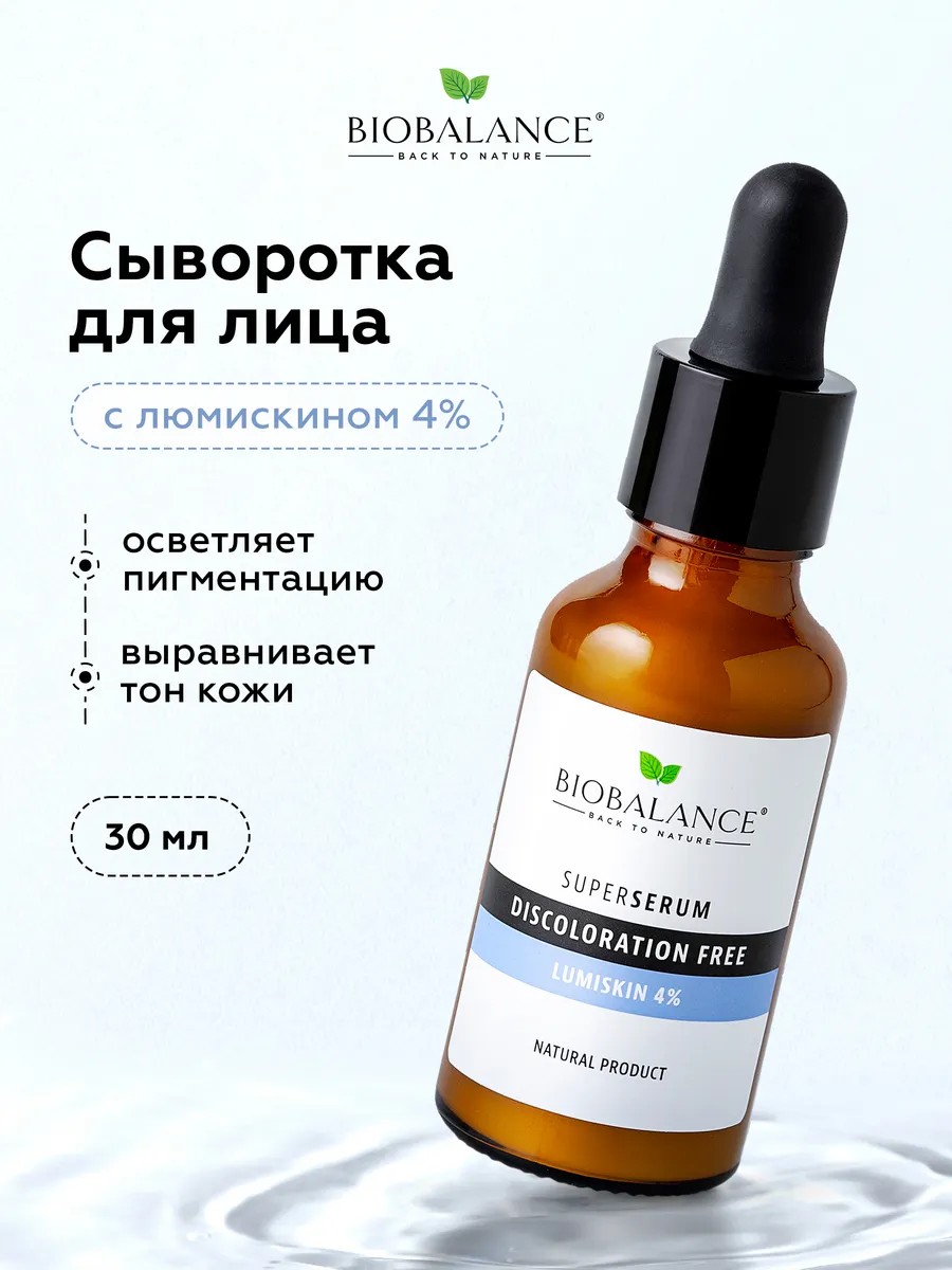 BIOBALANCE Сыворотка SUPER SERUM DISCOLORATION FREE LUMISKIN 4% - уходовая брендовая сыворотка, предназначенная для всех типов кожи: комбинированной и жирной кожи, подростковой, возрастной и молодой, очень сухой кожи, а также для чувствительной. Ночная и дневная сыворотка эффективна для борьбы с несовершенствами кожи: постакне, пигментными пятнами, веснушками, гиперпигментацией. Обогащенная увлажняющими компонентами, она также подходит для выравнивания тона кожи, бороться с сухостью. Эта выравнивающая подарочная сыворотка - идеальное средство для девушек, взрослых и подростков, ухаживающих за своей кожей.