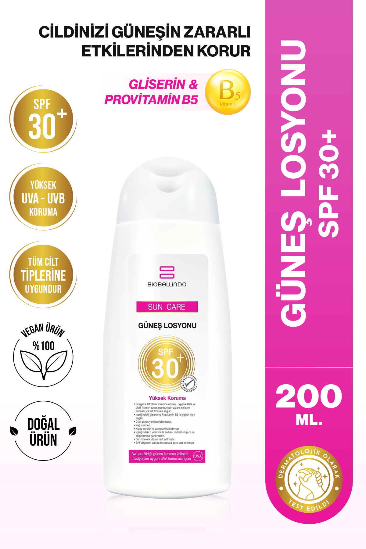 BioBellinda Sun Lotion Containing Glycerin and Provitamin B5 SPF 30 200 ml Continuous exposure to the sun causes great damage to your skin. Harmful rays from the sun cause your skin to wrinkle and deform prematurely. BioBellinda 200 ML SPF 30 Sun Lotion protects you from the sun and helps you fight against aging thanks to its effective formula. At the same time, its regular use preserves the color pigmentation and natural radiance of your skin. • It provides intense moisture to your skin with the glycerin and Provitamin B5 it contains. • SPF values tested according to the COLIPA method. • Dermatologically tested. • With the assurance of ecological certification, we protect our world with all personal care and cleaning product formulas, packaging and production processes, and do not harm our natural resources and human health. • Contains raw materials of natural origin. FEATURE Protect yourself from the Harmful Effects of the Sun SPF 30 Sun Lotion is suitable for all skin types, including the most sensitive skin. Thanks to organic UVA and UVB filters combined with inorganic filters, it maximizes protection by filtering the harmful rays of the sun. It helps protect against UVA UVB rays and provides intense moisture to your skin with the glycerin and Provitamin B5 it contains. It easily penetrates your skin and does not leave a sticky feeling. The vitamin E and antioxidant it contains prevent the formation of free radicals. BioBellinda 200 ML SPF 30 Sun Lotion is a product specially designed for you to use comfortably in all four seasons. SPF values tested according to the COLIPA method. To summarize the difference between lotion and cream, lotions are ideal in hot seasons such as summer and creams are ideal in cold and dry winter seasons. Lotions are more oily and slippery than creams, but are also lighter and softer.